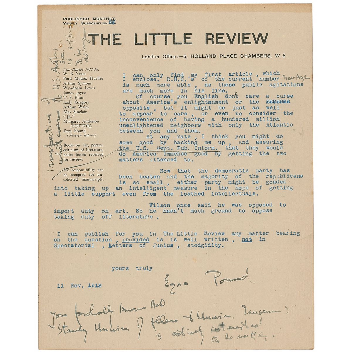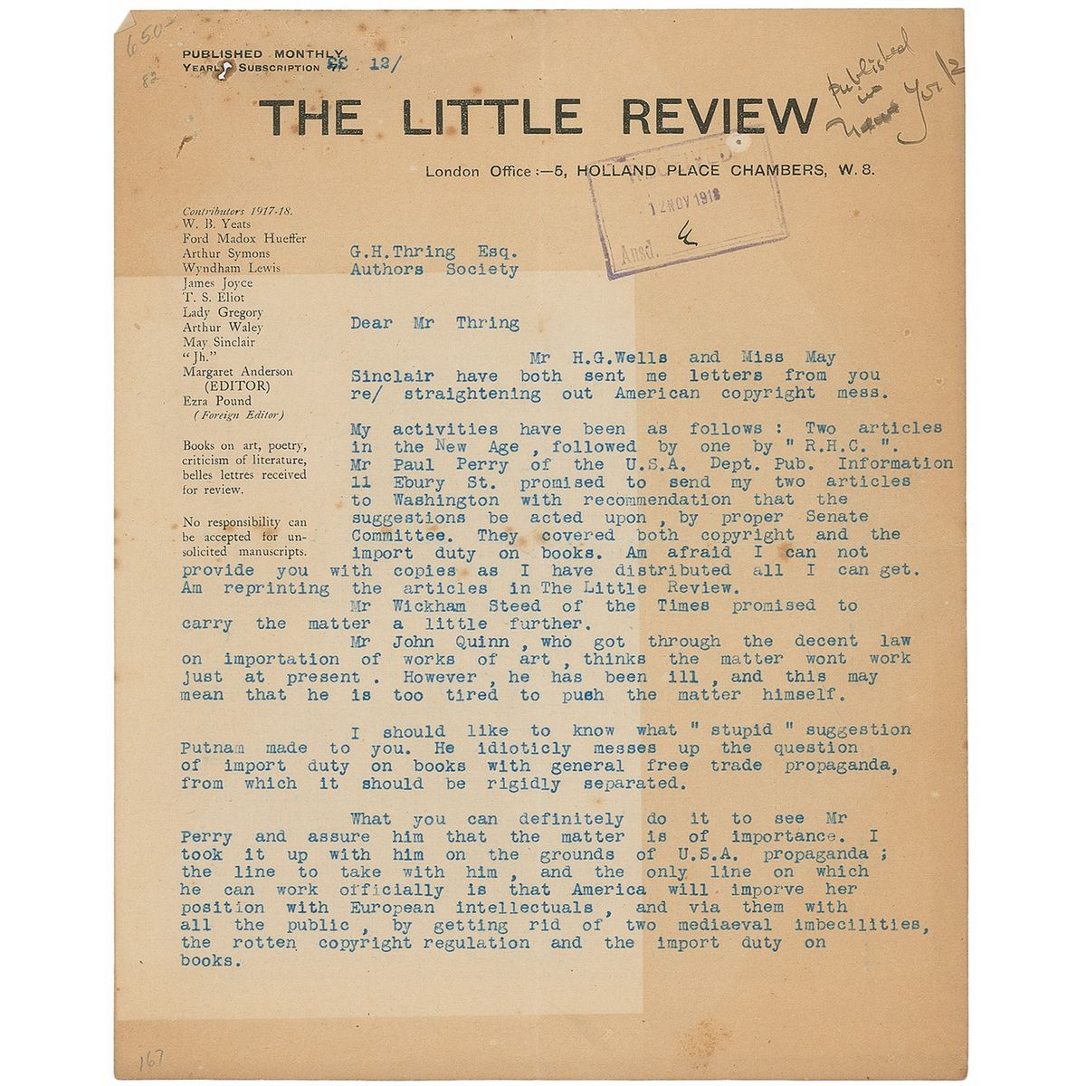 TLS, two pages, 8 x 10, The Little Review letterhead, November 1918. Letter to G. H. Thring of the Authors Society. In part: "Mr H. G. Wells and Miss May Sinclair have both sent me letters from you re/ straightening out American copyright mess. My activities have been as follows: Two articles in the New Age, followed by one by 'R. H. C.'…Mr. Paul Perry…promised to send my two articles to Washington with recommendation that the suggestions be acted upon, by proper Senate Committee. They covered both copyright and the import duty on books…Am reprinting the articles in The Little Review…Mr John Quinn, who got through the decent law on importation of works of art, thinks the matter wont work just at present…I should like to know what 'stupid' suggestion Putnam made to you. He idioticly messes up the question of import duty on books with general free trade propaganda, from which it should be rigidly separated…see Mt Perry and assure him that the matter is of importance. I took it up with him on the grounds of U. S. A. propaganda; the line to take with him, and the only line on which he can work officially is that America will improve her position with European intellectuals, and via them with all the public, by getting rid of two mediaeval imbecilities, the rotten copyright regulation and the import duty on books…Of course, you English don't care a curse about America's enlightenment or the opposite, but it might be just as well to appear to care, or even to consider the inconvenience of having a hundred million unenlightened neighbors with only the Atlantic between you and them…Now that the democratic party has been beaten and the majority of the republicans is so small, either party might be goaded into taking up an intelligent measure in the hope of getting a little support even from the loathed intellectuals…I can publish for you in The Little Review any matter bearing on the question, provided it is well written, not in Spectatorial, Letters of Junius, stodgidity." Pound adds a few notes in his own hand to the second page, noting that he is unsure of the opinion of the US Authors Society and identifying another individual concerned with the matter. In very good condition, with intersecting folds and significant blocks of toning and small stains to the first page. Accompanied by a modern photo of Pound.