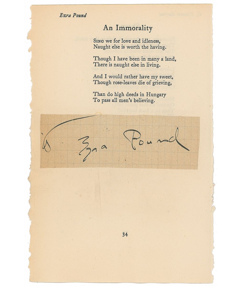 Bold ink signature, “Ezra Pound,” on an off-white 3.75 x 1 clipped slip, affixed to a 4.25 x 6.5 book page printed with Pound’s poem ‘An Immorality.’ A clipped signature of C. Kennett Burrow is affixed to the opposite side of the page, which features his poem ‘Sheep.’ In fine condition, with light creases and toning (creases affecting a few letters in the signature).