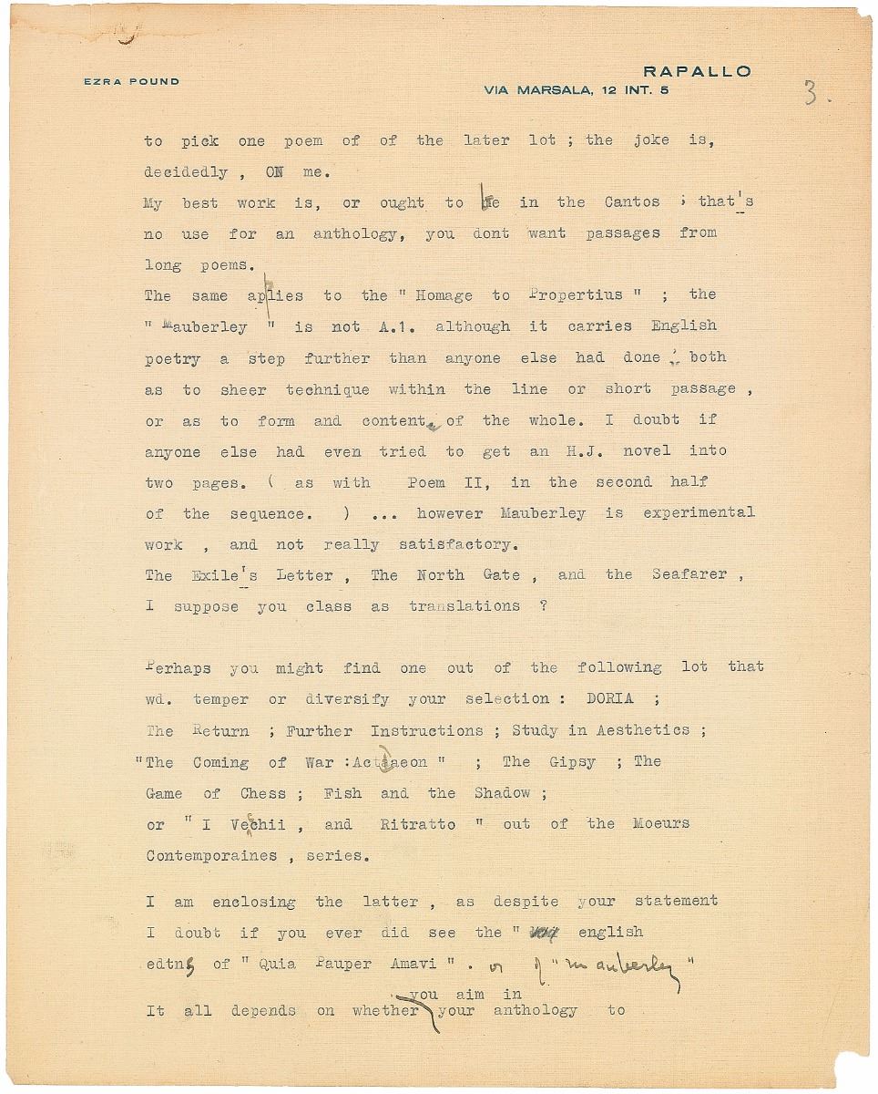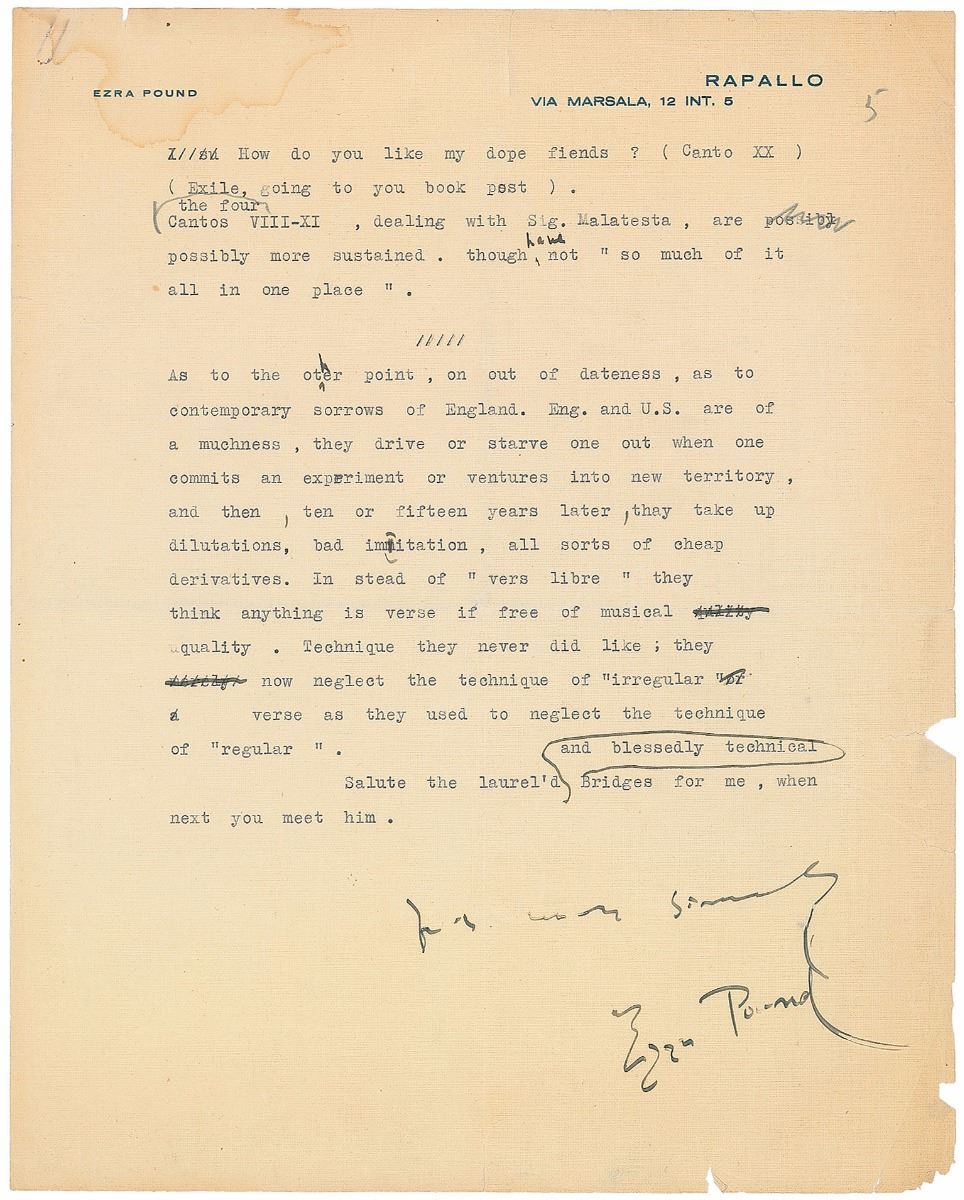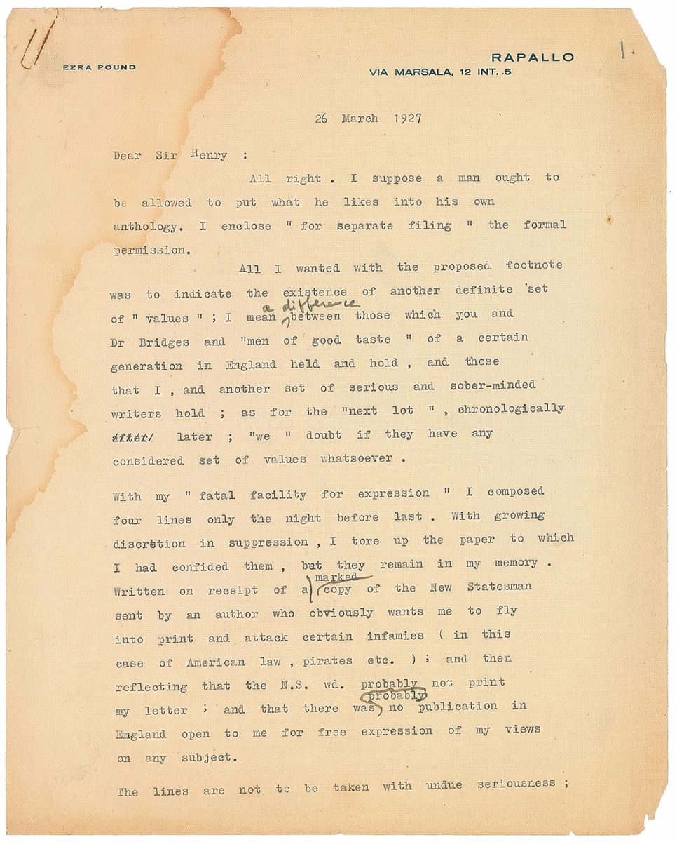 TLS, five pages, 9 x 11.5, personal Rapallo letterhead, March 26, 1927. Letter to English writer Sir Henry Newbolt. In part: “All right. I suppose a man ought to be allowed to put what he likes into his own anthology. I enclose ‘for separate filing’ the formal permission. All I wanted with the proposed footnote was to indicate the existence of another definite set of ‘values’; I mean a difference between those which you and Dr. Bridges and ‘men of good taste’ of a certain generation in England held and hold, and those that I, and another set of serious and sober-minded writers hold; as for the ‘next lot,’ chronologically later; ‘we’ doubt if they have any considered set of values whatsoever…