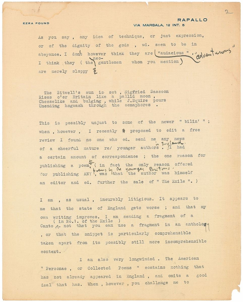 I am, as usual, incurably litigious. It appears to me that the state of England gets worse; and that my own writing improves. I am sending a fragment of a Canto (in No. 1. of the Exile) not that you can use a fragment in an anthology, or that the snippet is particularly comprehensible taken apart from its possible still more incomprehensible context.