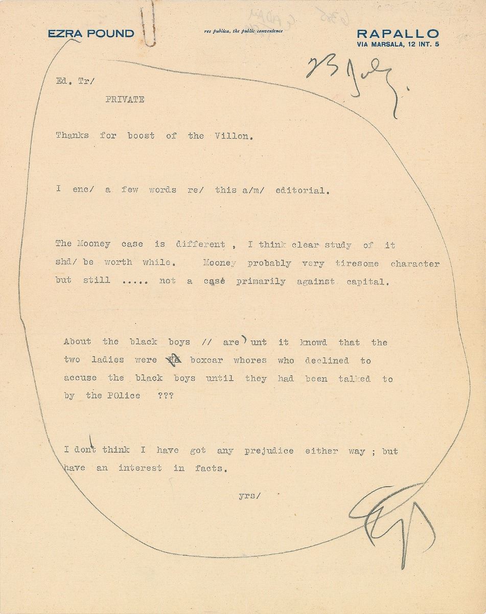 TLS signed in pencil “EP,” one page, 8.75 x 11.25, personal letterhead, July 23, no year but circa 1938. Letter headed "Ed. Tr/ Private," in full (spelling and grammar retained): "Thanks for boost of the Villon. I enc/ a few rods re/ this am/ editorial. The Mooney case is different, I think clear study of it shd/ be worth while. Mooney probably very tiresome character but still….not a case primarily against capital. About the black boys // are'unt it knowd that the two ladies were boxcar whores who declined to accuse the black boys until they had been talked to by the Police??? I don't I have got any prejudice either way; but have an interest in facts." Pound circles the text and makes a few handwritten corrections. In fine condition, with a paperclip impression to the top edge and small splits along folds. Pound references Thomas Mooney, a labor leader responsible for the Preparedness Day Bombing in San Francisco, and the Scottsboro Boys, nine black Alabama teenagers accused of raping two white women on a train in 1931.