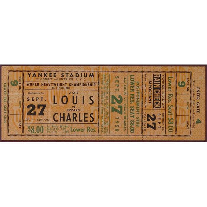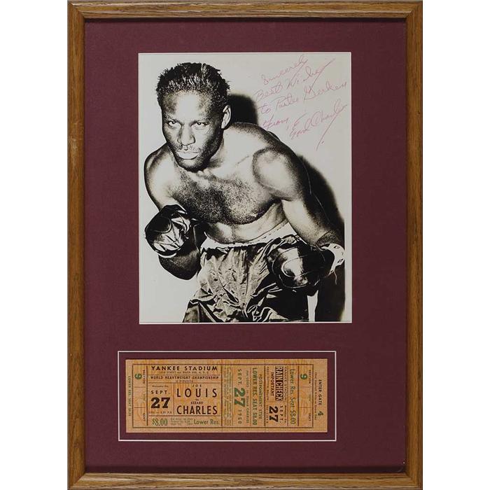 Boxer (1921–1975) who held the World Heavyweight title from 1949 to 1951. Vintage glossy 8 x 10 photo, signed and inscribed in pink ballpoint “Sincerely, Best wishes to Paster [sic] Gerken from Ezzard Charles.” Matted and framed with an original $8.00 onsite full unused lower reserved seat ticket to the September 27, 1950, fight between Charles and Joe Louis at Yankee Stadium (after this fight Charles became universally recognized as World Heavyweight Champion), to an overall size of 12.25 x 17. In fine condition, with some light skipping to portion of inscription. It was at this 1950 bout that Charles out-pointed his idol and former world heavyweight champion Louis to become the undisputed champion. Pre-certified Steve Grad/PSA/DNA and RRAuction COA.