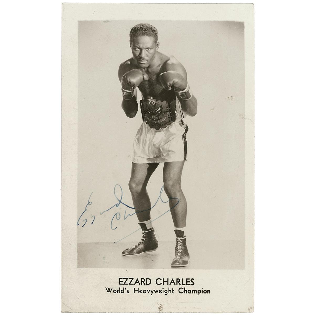 Boxer (1921–1975) who held the World Heavyweight title from 1949 to 1951. Vintage 3.5 x 5.75 postcard photo of the boxer wearing his championship belt, signed in fountain pen. In very good condition, with scattered creasing, a few surface scratches, light spotting to the emulsion and a tack hole at the bottom border.