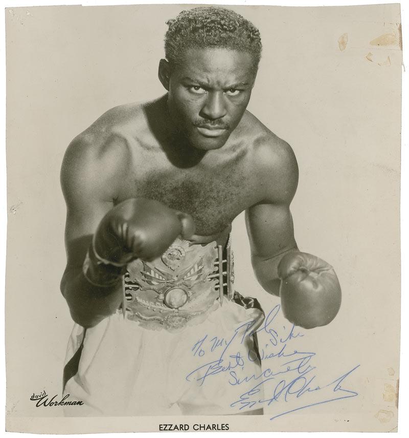 Boxer (1921–1975) who held the World Heavyweight title from 1949 to 1951. Vintage glossy 7.5 x 8.25 photo, signed and inscribed in blue ink “To my pal Siki, Best Wishes, Sincerely, Ezzard Charles.” In very good condition, with scattered light creases, light soiling, small pin holes along the far left side, and trimmed edges. Scarce in larger sized photos.