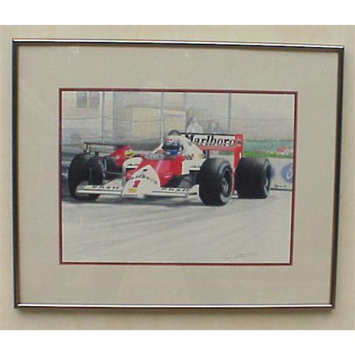 A really nice draming of Alen Prost in the McClaren F-1 car when he won the World Championship. This an origional drawing, not a repro.