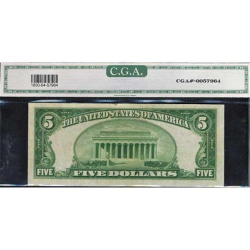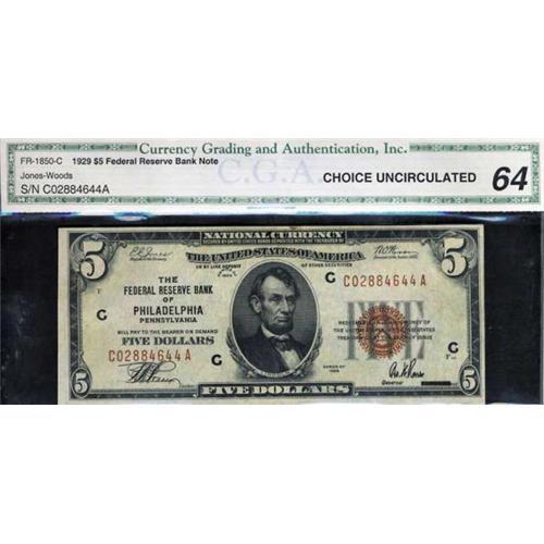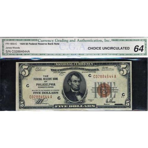 <b>F-1850-C. 1929. $5 Federal Reserve Bank Note. CGA Choice Uncirculated 64. CGA graded Choice Unc.</b> Philadelphia district. An emergency release of the first Roosevelt administration, the country was flooded with paper money once FDR seized the gold backing of America's paper money, allowing him to inflate prices in a futile attempt to stem the Great Depression.