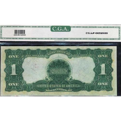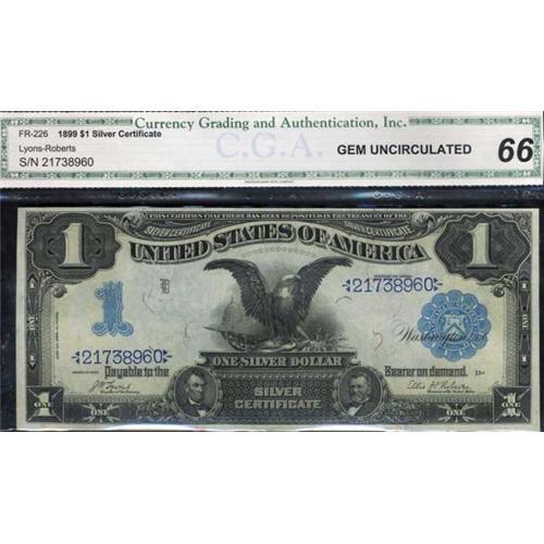 <b>F-226. 1899. $1 Silver Certificate. CGA Gem Uncirculated 66. CGA graded Gem Unc.</b> The popular "black eagle" silver certificate with fresh crisp paper, great color, and outstanding appearance.