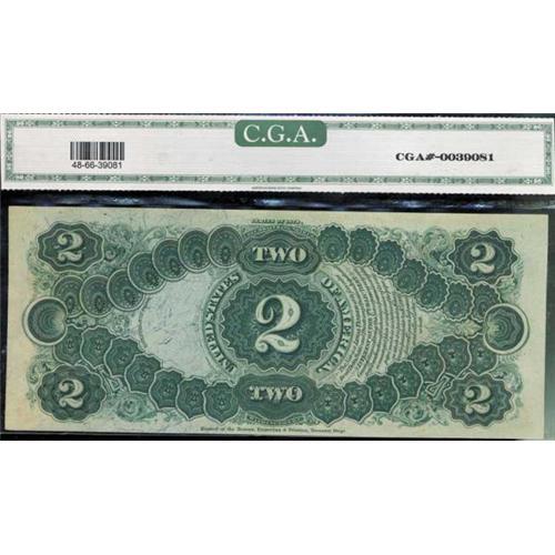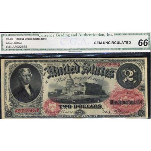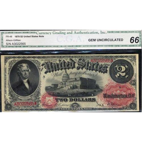<b>F-48. 1878. $2 Legal Tender. CGA Gem Uncirculated 66. CGA graded Gem Unc.</b> The popular red seal, red serial number Series of 1878 deuce with its colorful front, outstanding appearance and fresh look. Nicely centered, as well.