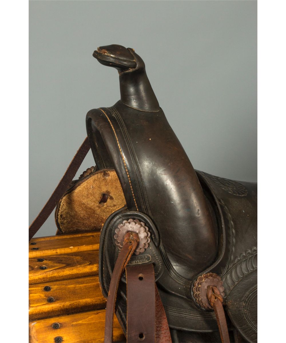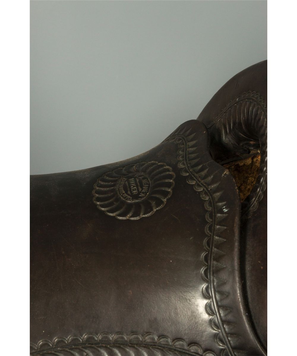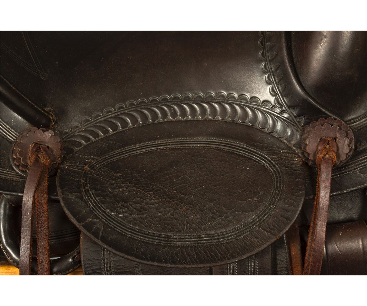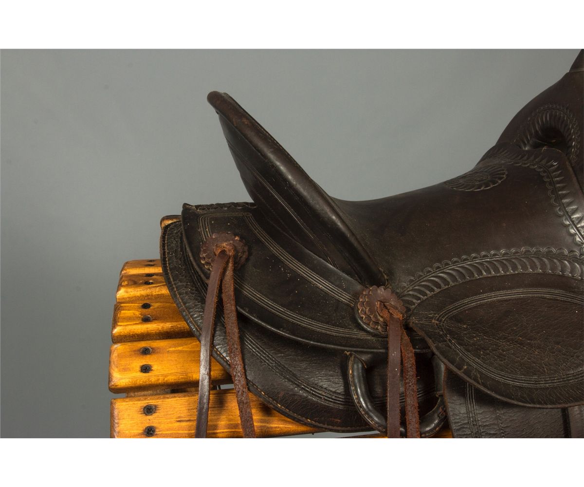 F. A. Meanea (Cheyenne, WY.) Youth Saddle. 14" seat. High back cantle. Tooled border. Maker marked on seat and on the left side of pommel. Circa 1910-1920. Provenance: Estate of Jim Nicholls.