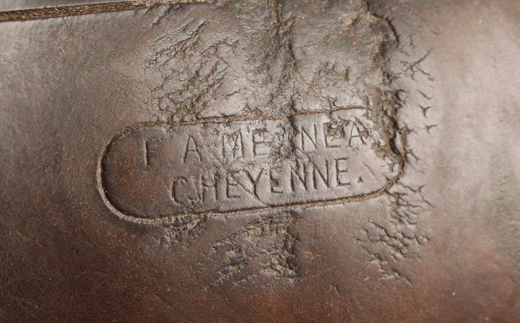Smooth brown leather with line work with nickel conchos, marked twice. In good condition.