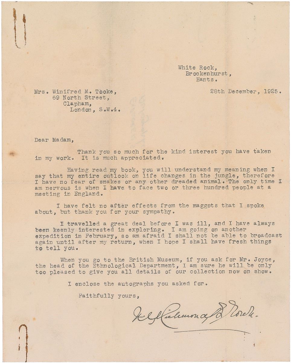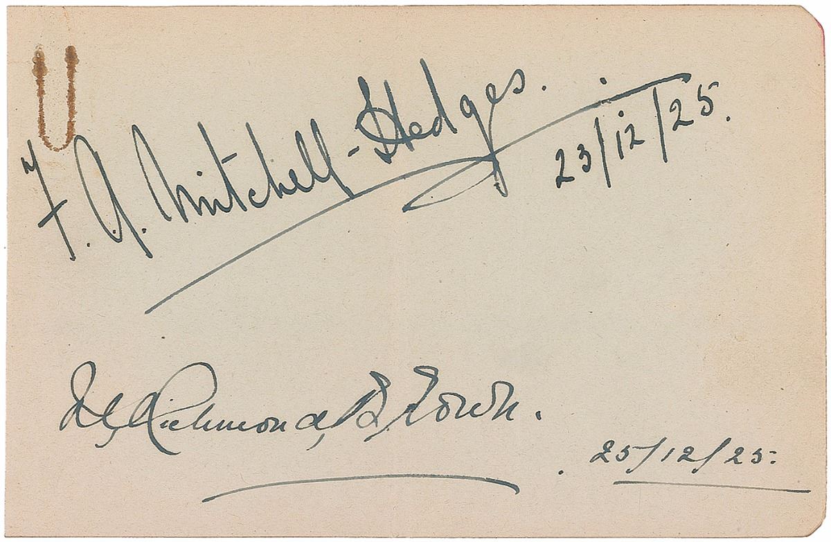 English adventurer, traveler, and writer (1882–1959) known for his discovery of the legendary ‘Crystal Skull.’ Fountain pen signature, “F. A. Mitchell-Hedges, 23/12/25,” on an off-white 6 x 4 album page, also signed by Lady Lillian Richmond Brown. A rusty paperclip mark to the upper left, otherwise fine condition. Also includes a 1925 TLS by Lady Richmond Brown, who was an early woman explorer and traveling companion of Mitchell-Hedges.