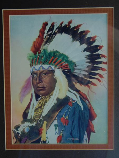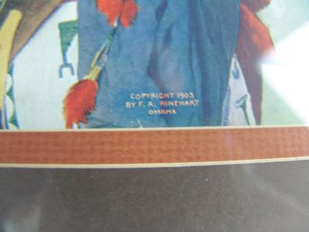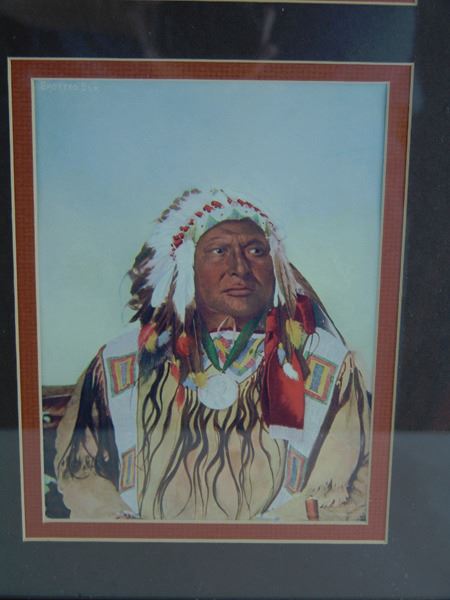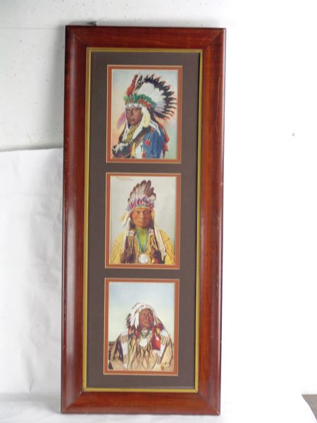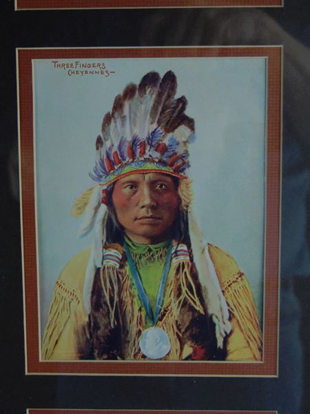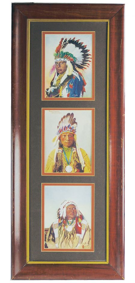Mid 1900s, Framed presentation of three full colorful offset prints of his famous hand tinted photos: "Big Man," "Three Fingers - Cheyenne," and "Spotted Elk." Very good condition. In antique frame 9" x 7" each (34" x 14" framed)