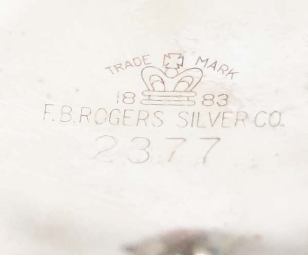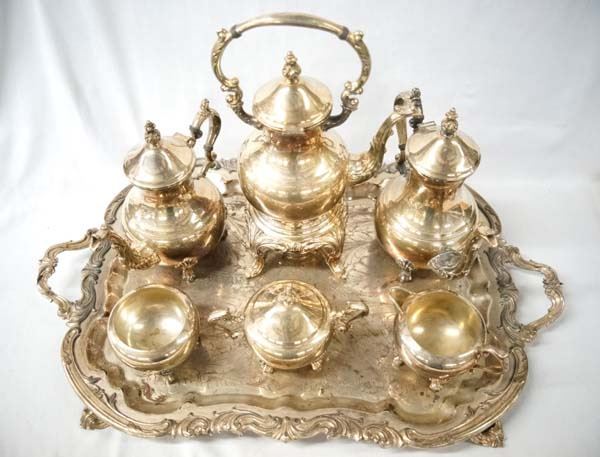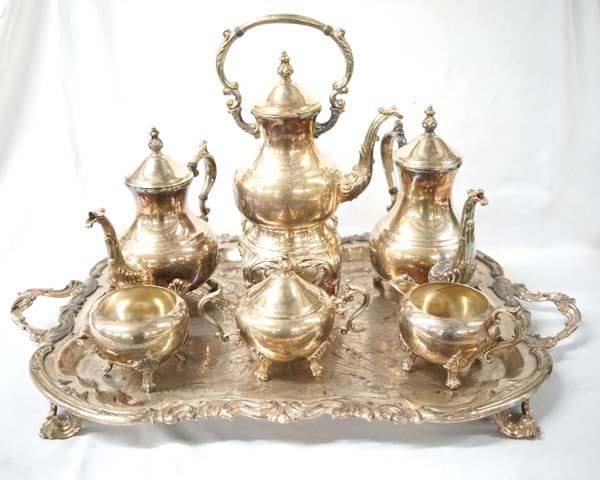 From the Proctor Estate in Silver City NM, we have an F.B. Rogers Silver Co. Tea and Coffee Service Set, 7 piece set which includes coffee pot, teapot, tilt server for coffee or tea, waste pot, cream and sugar, and large serving tray, tray measures 29''L x 19''W x 2''H, all pieces are hallmarked and numbered 2377, tray is very heavy