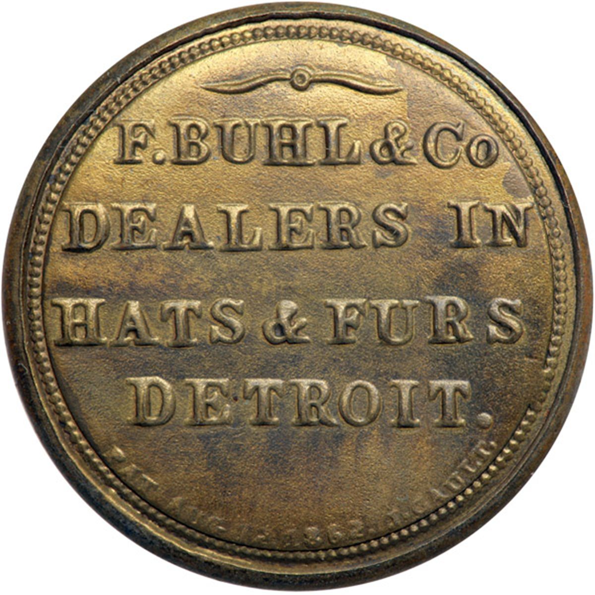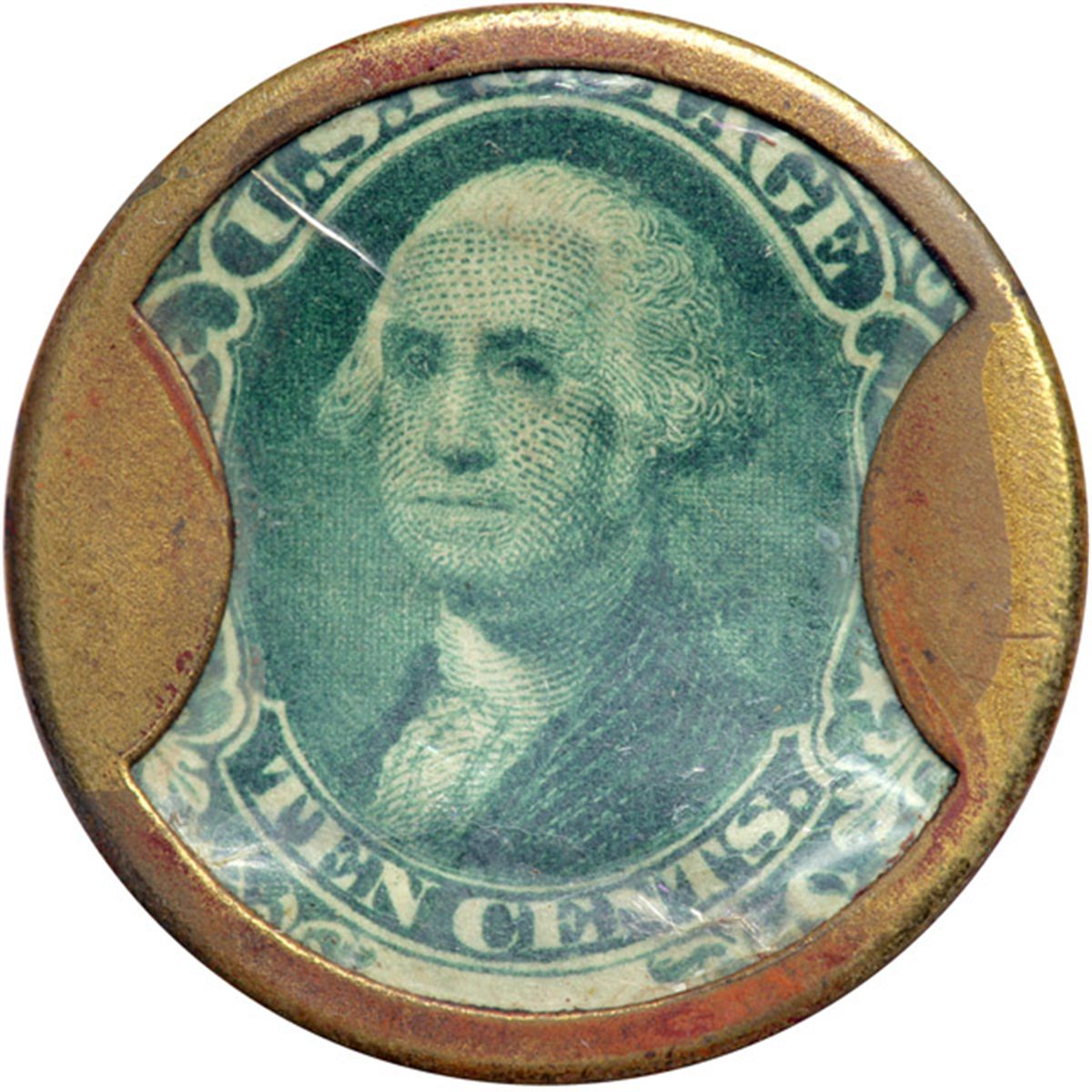"F. BUHL & CO." EP-104, HB-70, S-41 10¢. . Fr-EP-104. Although the case is slightly bent and a little brassy from an old cleaning, it appears free of any tampering and has good eye appeal overall. The mica is substantially clear with only some localized crazing and a single crack at about 10:00 near the frame. The stamp is well centered and has ideal color and brightness. A really good looking piece despite its flaws, and one of only an estimated dozen or so pieces believed to be extant. Very Fine.