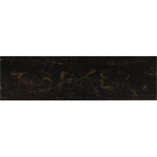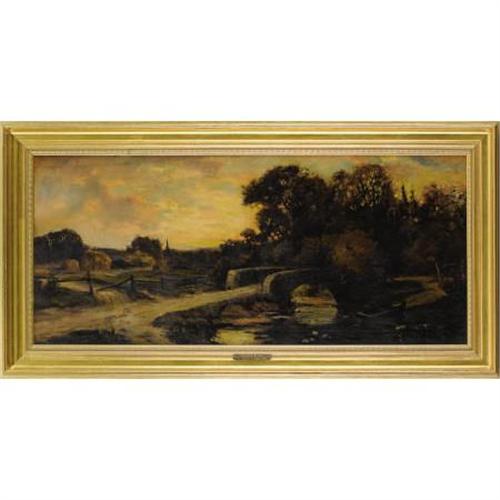 <B>F. BAKER</B></I> <B>(British or American, 19th Century)</B></I><BR><I>South Bridge at Concord</B></I><BR>Oil on canvas<BR>18 x 40 inches (45.7 x 101.6 cm)<BR>Signed lower right: <I>F. BAKER</B></I><BR> <BR>PROVENANCE:<BR>Young Fine Arts Gallery, May 8, 1993, lot 33<BR><BR>There are several nineteenth-century landscape painters who sign similarly as "F. Baker." Consequently, this painting cannot be attributed definitively to a specific figure. The strongly horizontal format and the rich atmospheric shadows do point to a painter who had been familiar with artists associated with the etching revival.<B>Condition Report:</B> A few tiny losses in sky, otherwise very good condition.<BR><BR><b>Shipping:</b> Framed - without Glass, Medium (<a target="_blank" href="http://www.heritageauctions.com/common/shipping.php">view shipping information</a>)