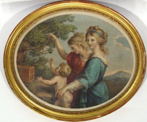 F.Bartolozzi- Coloured print of young girls playing with a child and bird together with one other 19