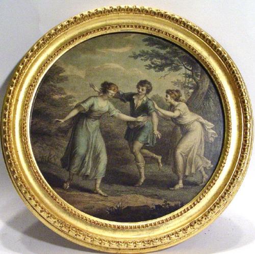 F.Bartolozzi- Coloured print of young girls playing with a child and bird together with one other 19th Century print of young women and a man playing a blindfolded game, both in gilt frames, largest 26cm diameter