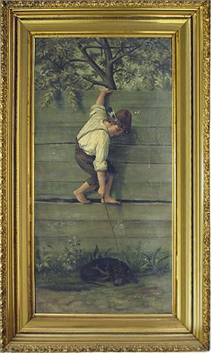 F. Bindewald oil on canvas; boy on fence teasing dog; signed lower right; late 19th to early 20th C. American; framed; 36" x 18" (overall crazing, spots of paint loss throughout)