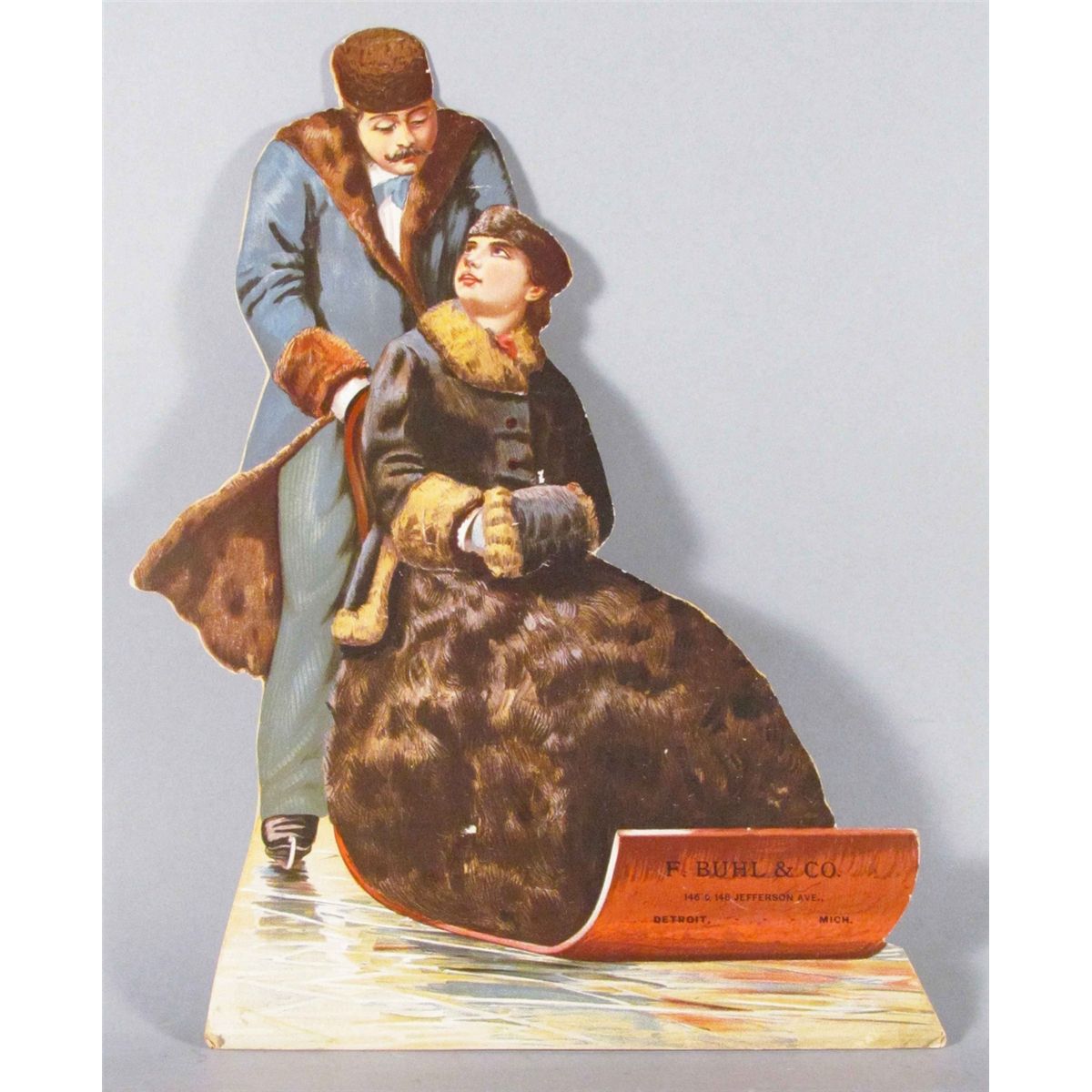 F.Buhl & Co. Haberdashery, Detroit, MI. Die Cut Cardboard Sign. Men's hats pictured on back side. Staining back side only otherwise excellent condition. 9 1/2 X 12 inches. Start Price $30