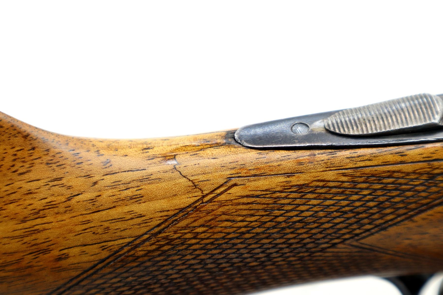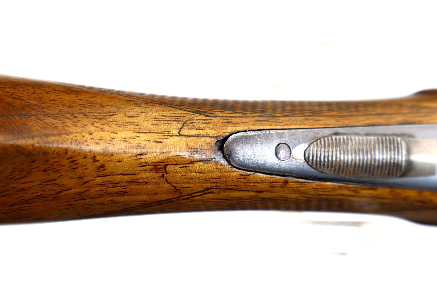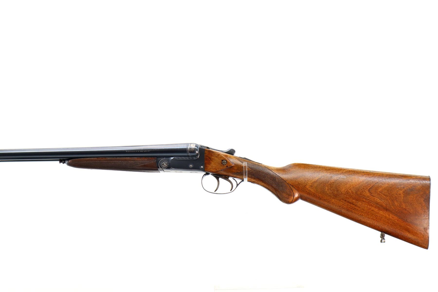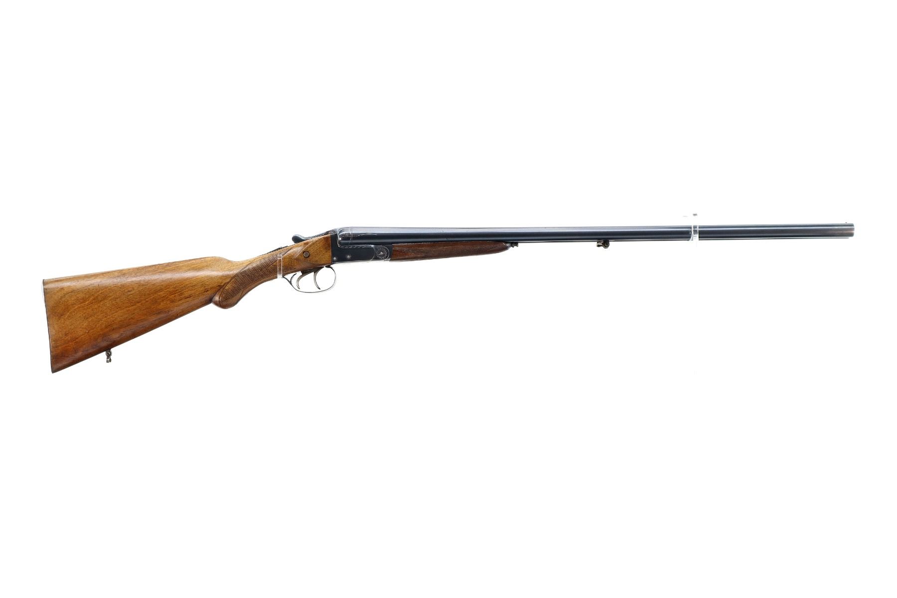 Main Description: Brass bead, blued finish, solid rib, automatic safety, requires repair or adjustment, extractor, double triggers. Two piece wood stocks, checkered forearm and pistol grip, cracked and repaired behind receiver and upper tang, grooved steel butt plate, sling swivels.