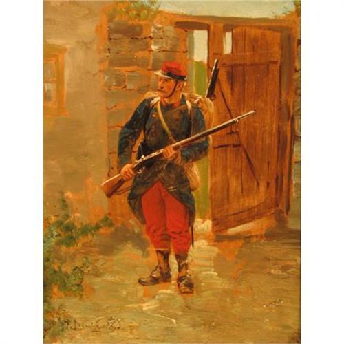F. Dulainey - French School Oil on Board. Well executed oil on wood panel shows a soldier of apparent French dress on patrol as he passes through a garden gate. Signed lower left ?F. Dulainey?? Housed in an antique gold gesso decorated frame with gold liner. French School - 19th century Over all measurement is 20" high by 16 1/4 wide. Sight size is 13 1/2" high by 9 3/4 wide.