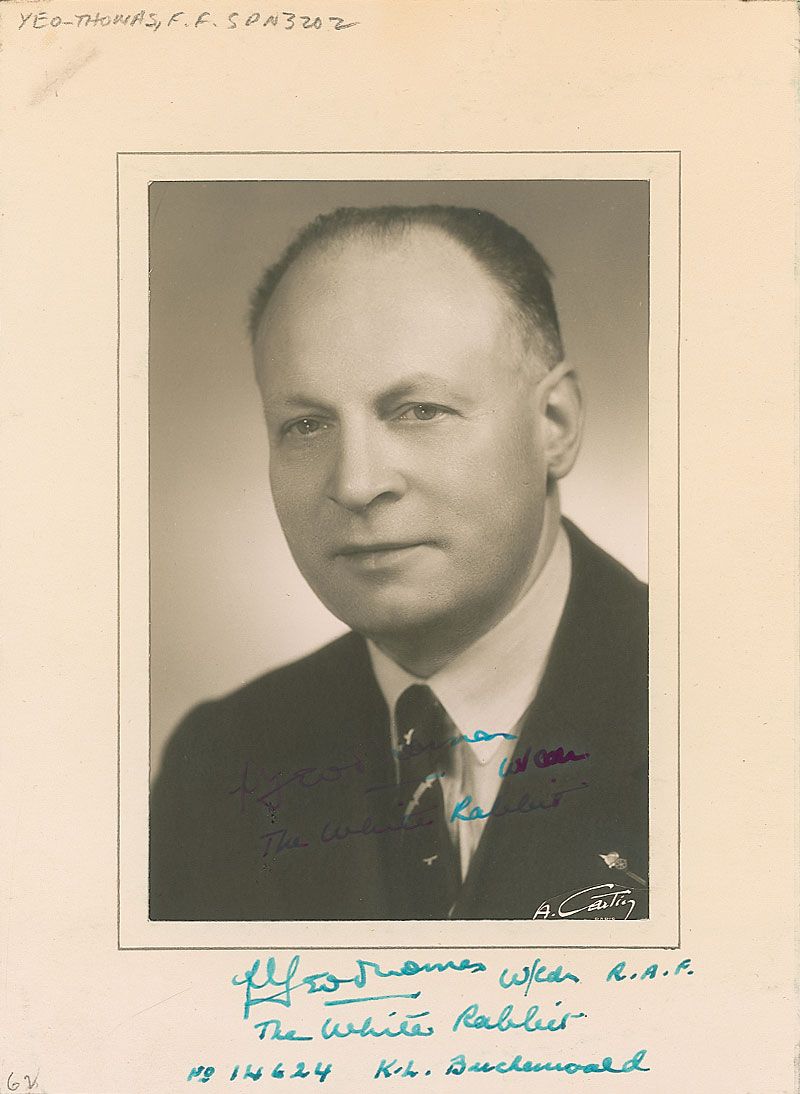 British Special Ops Executive (1902–1964) known to the Gestapo as ‘The White Rabbit.’ Vintage matte-finish 4 x 5.75 photo, signed and inscribed in fountain pen “F. Yeo-Thomas, W/Cdr., The White Rabbit.” Photo is housed in its original 6 x 8.25 presentation folder, which is signed again on the lower border by Yeo-Thomas. Moderate contrast to signature, and some wrinkling and a pencil notation to folder, otherwise fine condition.