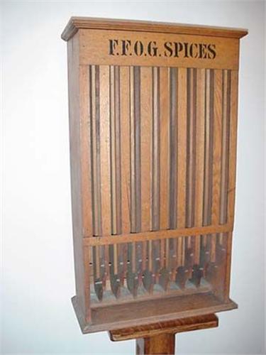 F.F.O.G. spice rack from Country store - extremely rare - all oak with lift door on top to restock, 35" x 23" Ex. cond.