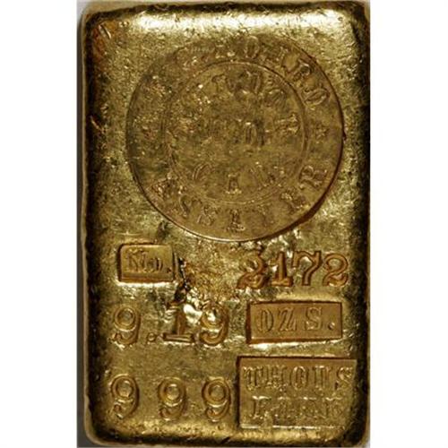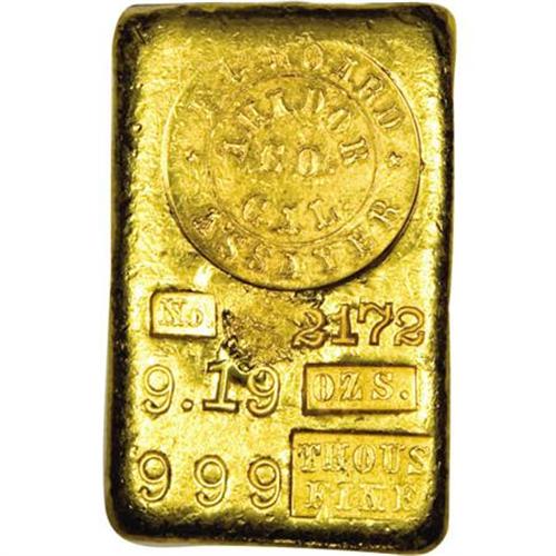 <B>F.G. Hoard MS Gold Ingot. 9.19 Ounces.</B></I> Several Hoard ingots and about a dozen Star ingots surfaced in the November 1969 Glendining Sale. These are curiosities and the subject of ongoing research with physical and chemical tests conducted recently. They are prized as commemorative gold antiques. This particular piece has the Hoard circular imprint at the top of the front followed by No. 2172 / 9.19 OZS / 999 THOUS / FINE. The ingot measures 22 x 50 mm.<BR><BR><b>Shipping:</b> Coins & Currency (<a target="_blank" href="http://www.heritageauctions.com/common/shipping.php">view shipping information</a>)