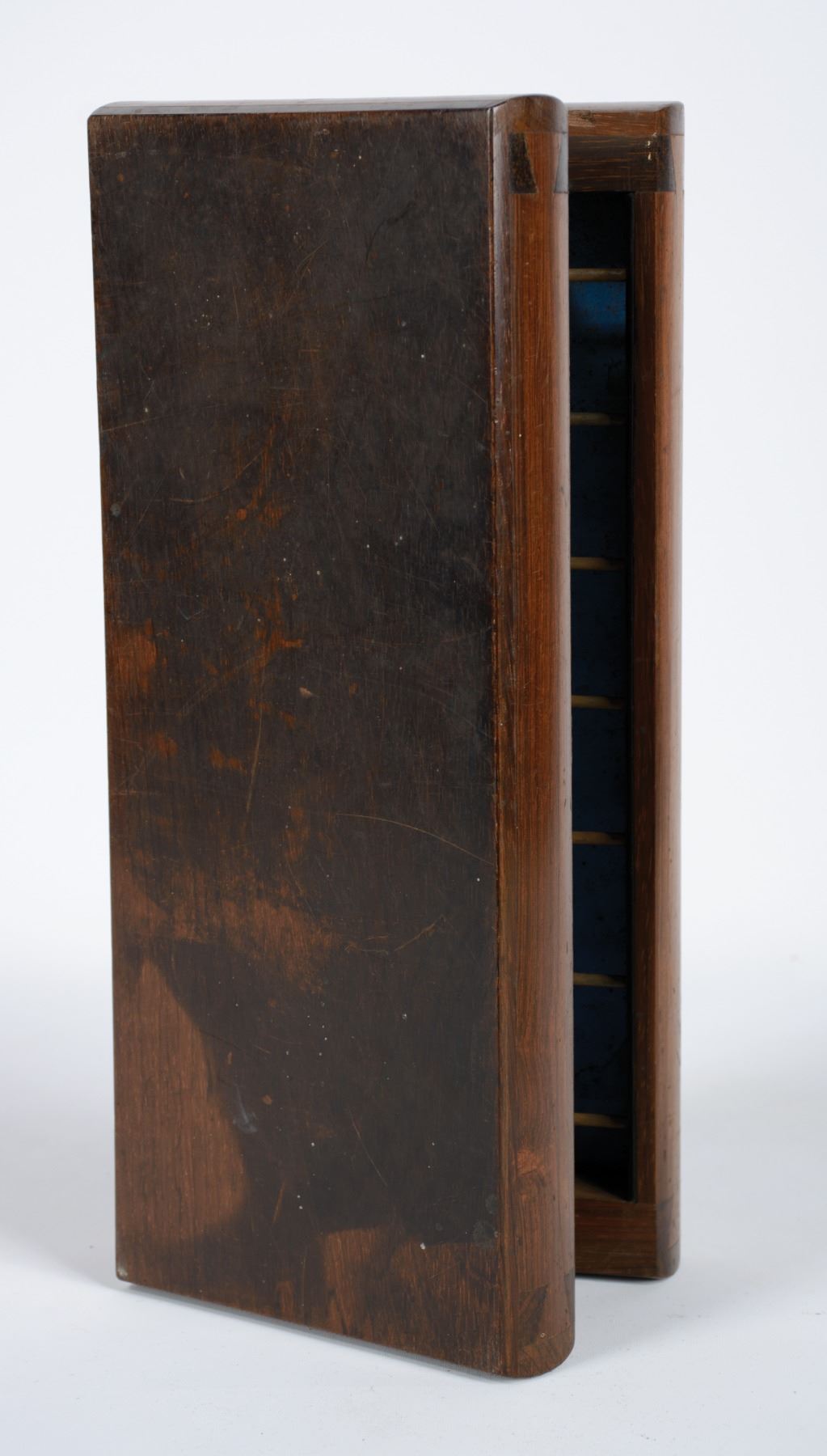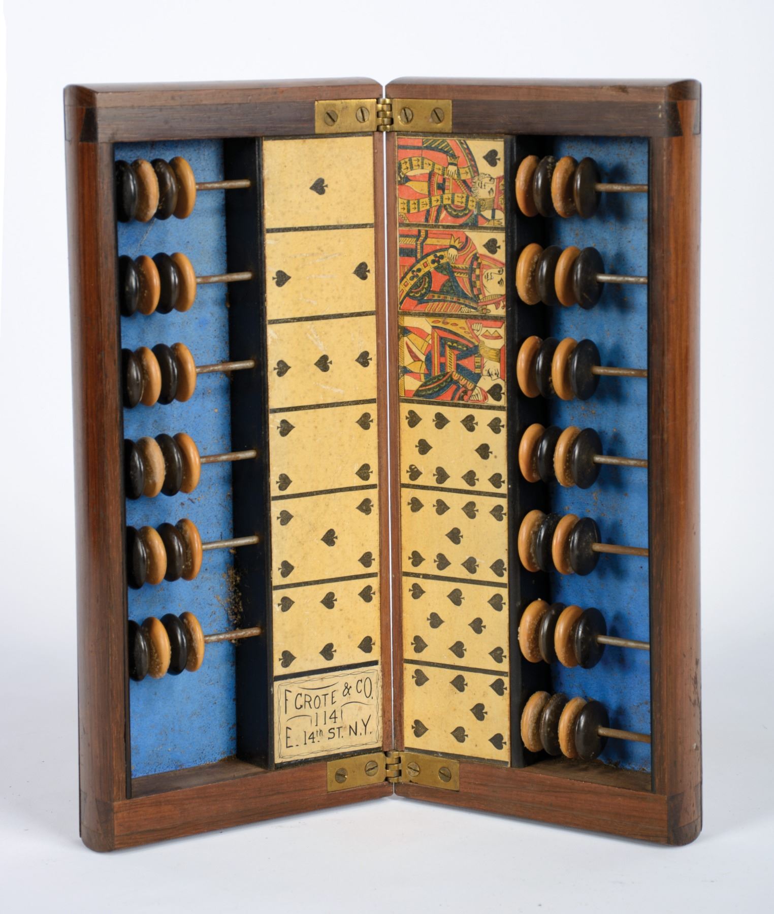 Early saloon style case keeper. Wood case with dovetailed corners and solid sides, 2-color wood beads, varnished paper card strips. Marked on lower panel, F. Grote / 114 / E. 14th St. N.Y., brass hinges. 12" x 10 1/2" (open).