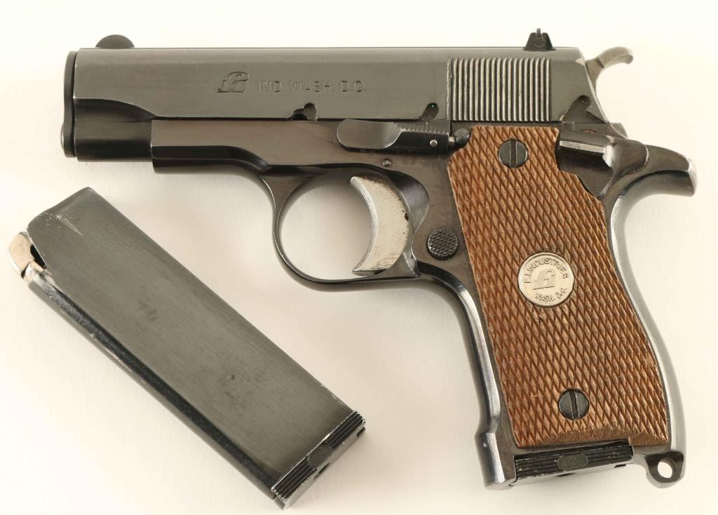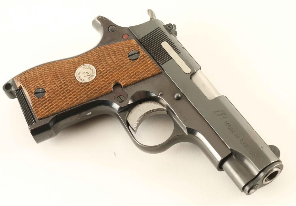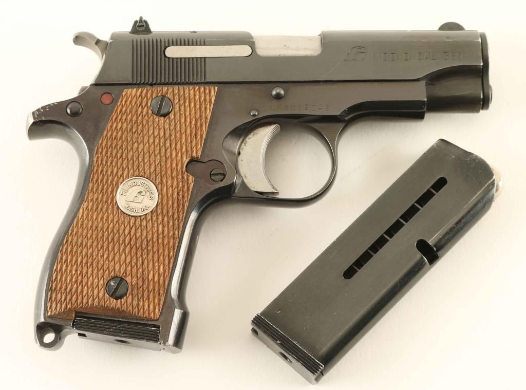 Single action semi-automatic compact pistol chambered in .380 Auto. It is highly likely that the frame and other components were made is Spain by Star in anticipation that it would be sold to Colt with the serial number prefix "CPA" for Colt Pony Automatic. Features a polished blued finish, 3" barrel, full-length guide rod, round blade front sight, drift adjustable rear sight, smooth trigger with beveled & serrated edges, knurled wide hammer spur, manual safety/slide catch on the left side of the frame, push button magazine release, 6 round magazine, steel frame with a shortened beavertail & integral lanyard loop, and two-piece checkered wood grips with F.I. Industries medallions. Includes a spare magazine. Pistol exhibits approximately 92% of it's original blued finish showing handling marks, bare metal on the back of the beavertail and the frame turned slightly plum. Action is sound, the bore is good and the wood grips are very good with a few damaged points. Condition is NRA Very Good. ***Modern Firearm***