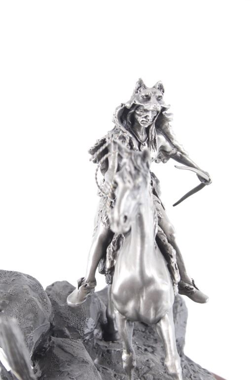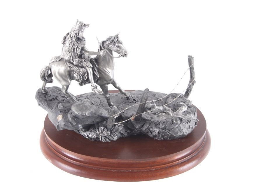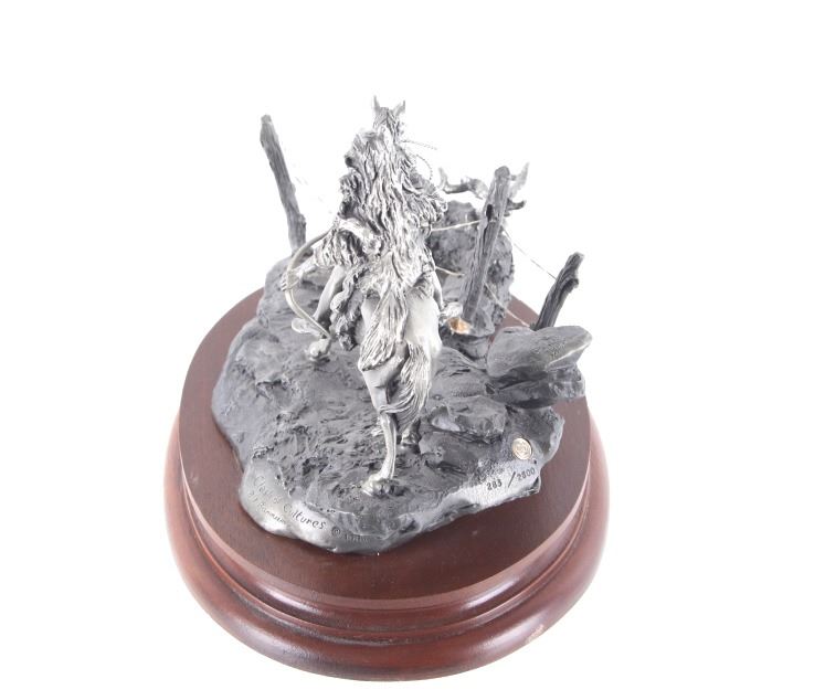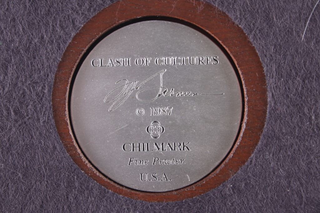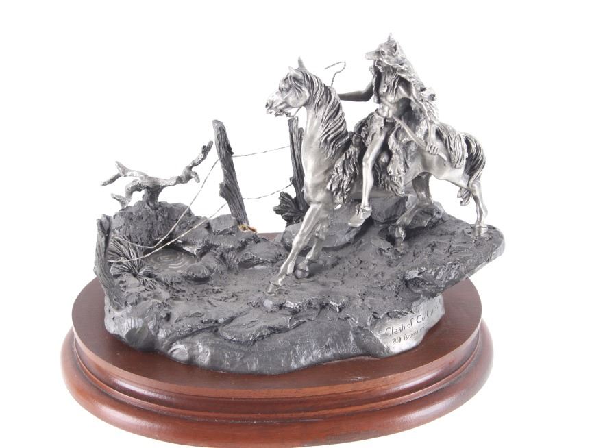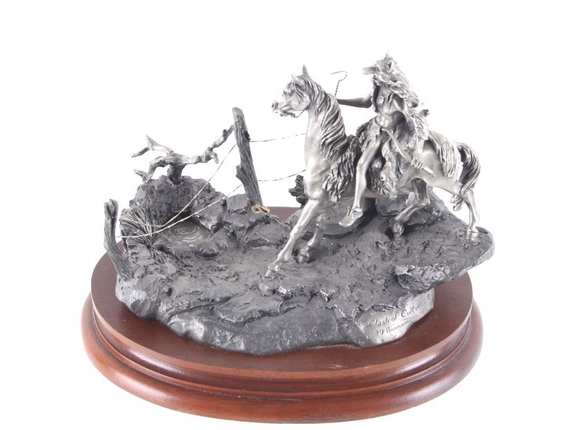 For your consideration is this limited edition Francis J. Barnum pewter sculpture titled "Clash Of Cultures" from 1987. The piece shows a Native American on horseback holding a bow and wearing a wolf headdress, as his path is blocked by a wood and wire fence. On the sculpture the sculptor's signature is on the base, along with the title and date reading "Clash Of Cultures, FJ Barnum 1987". On the backside of the sculpture it is stamped "283/2800" showing that it is a limited edition. Under the solid wood base it shows the title "Clash Of Cultures, the sculptor's signature "FJ Barnum", the presenter "Chilmark Fine Pewter USA" and the copy right date "1987". Overall this piece is in good condition with no signs of damage. It measures 7" L x 5 1/4" W x 6" H.