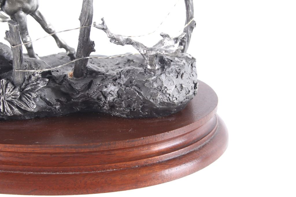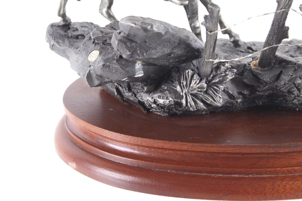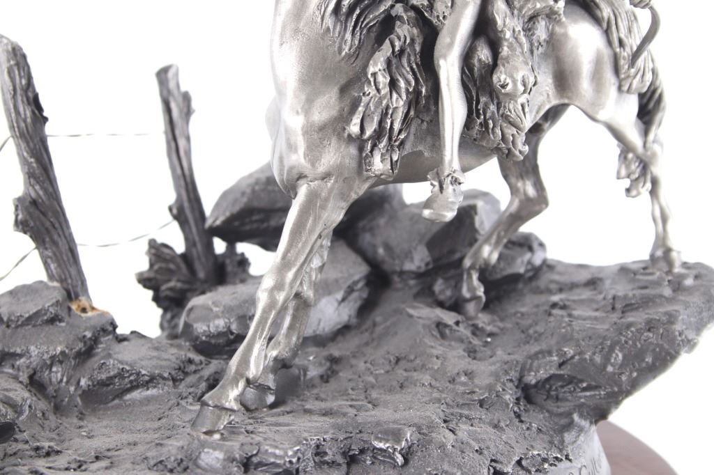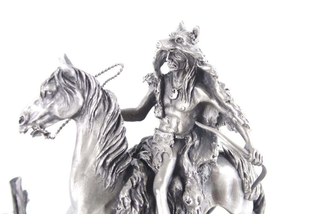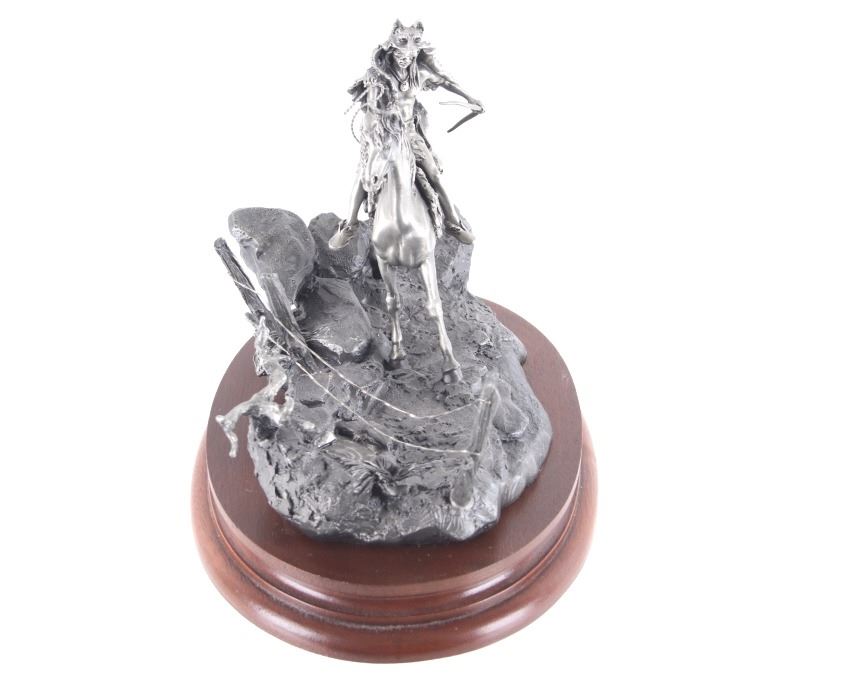 For your consideration is this limited edition Francis J. Barnum pewter sculpture titled "Clash Of Cultures" from 1987. The piece shows a Native American on horseback holding a bow and wearing a wolf headdress, as his path is blocked by a wood and wire fence. On the sculpture the sculptor's signature is on the base, along with the title and date reading "Clash Of Cultures, FJ Barnum 1987". On the backside of the sculpture it is stamped "283/2800" showing that it is a limited edition. Under the solid wood base it shows the title "Clash Of Cultures, the sculptor's signature "FJ Barnum", the presenter "Chilmark Fine Pewter USA" and the copy right date "1987". Overall this piece is in good condition with no signs of damage. It measures 7" L x 5 1/4" W x 6" H.