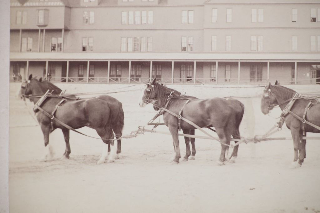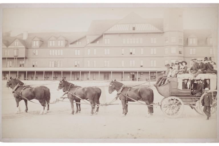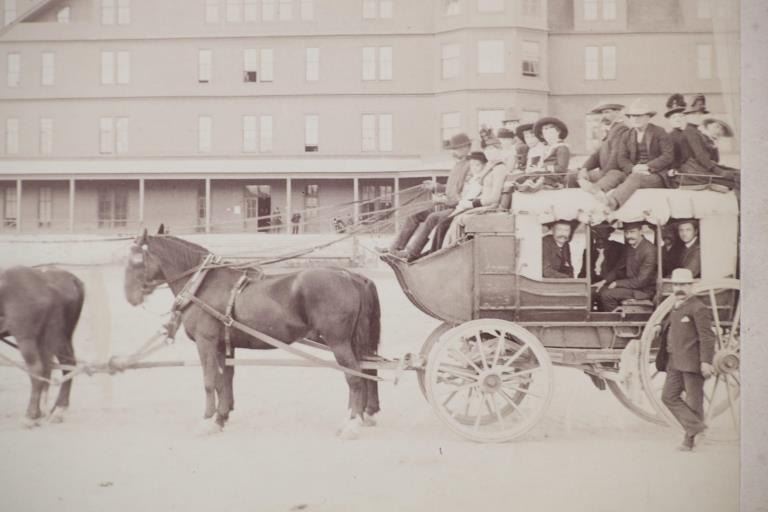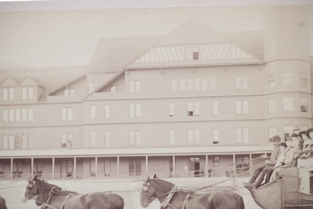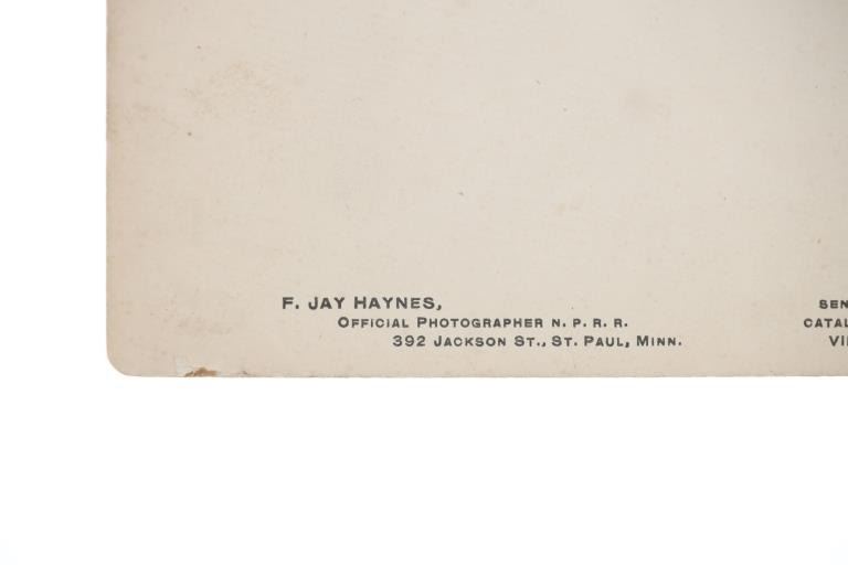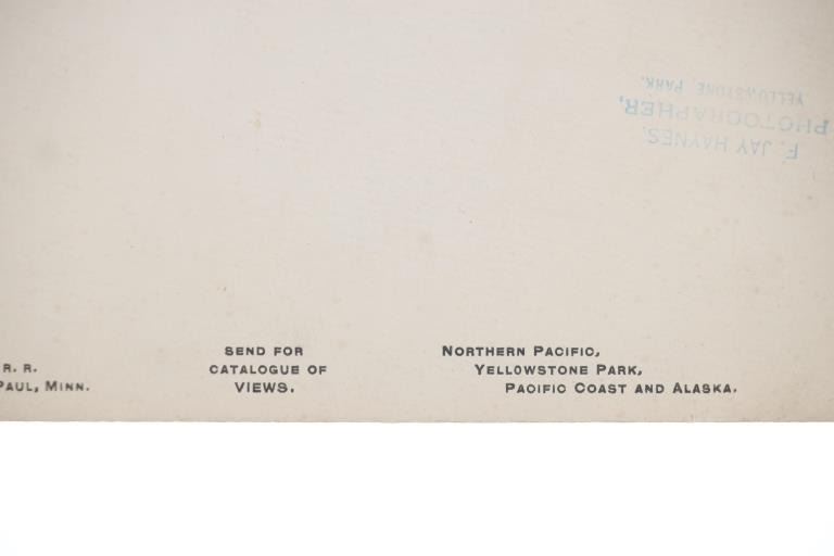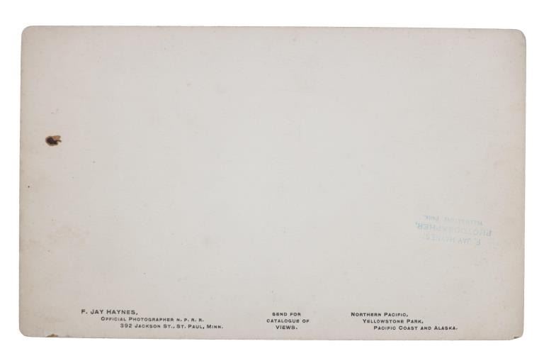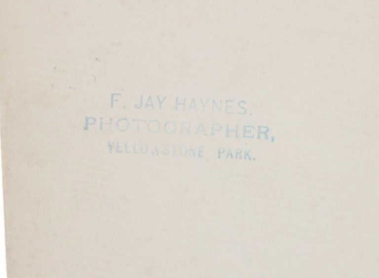 This is an original albumen photograph large format boudoir card by Frank Jay Haynes of the Mammoth Yellowstone National Park Stagecoach in front of the Yellowstone National Hotel circa 1880’s. Frank Jay Haynes, known as F.J. Haynes, F. Jay Haynes or the Professor to almost all who knew him, was a professional photographer, publisher, and entrepreneur from Minnesota who played a major role in documenting through photographs the settlement and early history of the great Northwest. This photo shows the Mammoth Stagecoach packed full with visitors as they look towards the photographer. It is drawn by six horses. Behind them sits the large and iconic Yellowstone National Hotel. The photo is marked on the back reading, "F. Jay Haynes Official Photographer N.P.R.R. 392 Jackson St., St. Paul, Minn. / Send For Catalogue of Views / Northern Pacific, Yellowstone Park, Pacific Coast And Alaska / F.J. Haynes Photographer Yellowstone Park". The Old Yellowstone Mammoth Hotel, originally called the National Hotel from 1883-1904 and later named the Mammoth Hot Springs Hotel & Cabins from 1977-Present, is shown in the background in its rarely seen original form with a six-horse teamed stagecoach at the front, bearing the Yellowstone National Park hand painted name across the lower side, as seen in the photograph. The stagecoach is overloaded with tourists, as it is about to begin its journey through the park site seeing. Original F.J. Haynes Fargo, DT (Dakota Territory) examples, such as this, are exceedingly rare, with this being a truly fine example with nice clarity in an original hand carved wood and gilt frame. This is a famous image and an original from the first negative; it is truly a wonderfully rare collectible. Different Stagecoach operators in the early days of Yellowstone included the Abbot-Downing Co., the Basset Brothers, Gilmer & Salibury, Marshall & Goff, the Wakefield Stage Companies, Yellowstone Transportation Co. YTC, James A. Clark, Cinnabar & Cooke Transportation Co., Livingston Enterprise ad, and Zack Root’s Express. It shows good condition overall with slight wear present from its age and use over the years, but no signs of damage is noted. The photo measures 5 1/4" L x 8 1/2" W and weighs under 6 ounces.