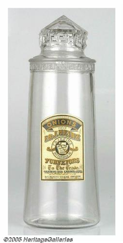 <B>F. & J. Heinz Greek Key Design Label Display Jar for Pickled Onions</B></I> After the banking panic of 1875, H. J. Heinz went into bankruptcy, but began again with his cousin Frederick and produced a product line under the F. & J. Heinz label. This unusual Greek Key glass jar is approximately 10 1/2" tall and sits flat, where some more common versions would be pedestaled at the bottom. Wider at the top than the bottom, the neck and lid both have the Greek Key design along with a frosted lid base and neck. The clear glass jar, in this case displaying the 1875 label for pickled onions, was used by Heinz to show his quality products. Unlike his competitors, Heinz did not use extra fillers and often tried different display jars in the marketing of his products. Other producers of similar products used darker blue or green bottles so the fillers were not obvious. This is a fine example of Heinz's early marketing strategy. It is in rare form, with no chips or problems. Lot:252