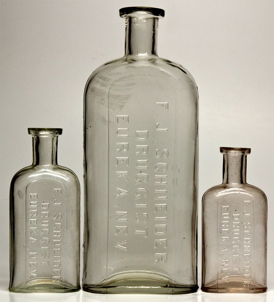 Lot of 3, embossed “F.J. Schneider Druggist Eureka, NEV”. 1) Measures 8.25,” this is an extremely rare size. Clear and clear glass. No chips. 2) Measures 4.75,” Clear and somewhat clean glass. Minor chips. 3) Measures 4.25”, clear glass with some stains and wear. No chips. Frank J. Schneider was a pioneer Nevada druggist. He spent most of his life traveling to at least 8 different mining camps throughout California and Nevada before settling down in Eureka for the rest of his life. His detailed drug store records shield a light on mining camp medicine. - Jacobitz Collection -59618