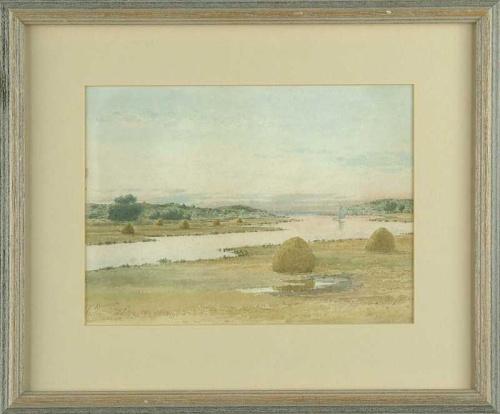 F. KIMBALL (American, 19th Century) SAILBOAT ON HAYSTACK LINED INLET. Fine watercolor coastal scene shows an inlet waterway with sailboat, low grasslands dotted with tall haystack mounds. Blue ocean is seen through break in low green covered hills. Signed lower left "F. Kimball 92". Possibly the work of C. F. Kimball, a Maine artist. Housed in a modern decorated molded wood frame with tan matte. SIGHT SIZE: 9-1/4" x 12-3/4". CONDITION: Good. 9-27232