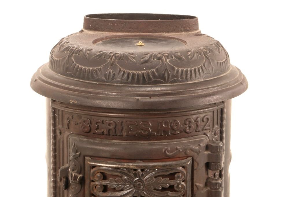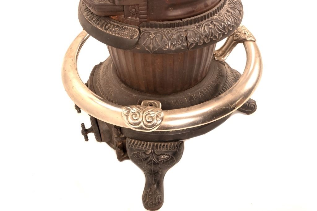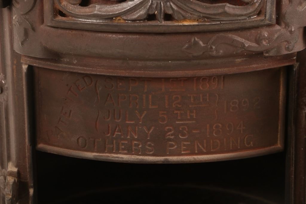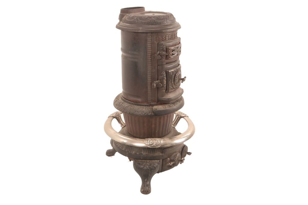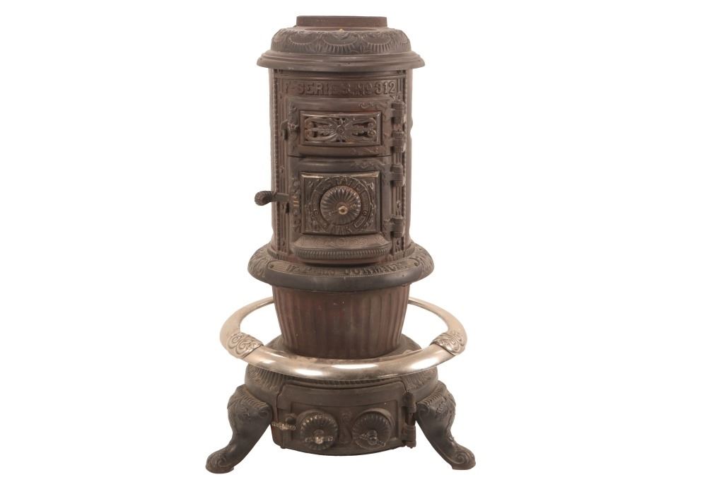 Featured in this lot is this F series no. 312 Wood stove from F. & L. Kahn & Bros, circa 1890-1894. The stove shows wonderful and professional construction and reads “W. P. McCormick” on the front; “Jointless Ashpit patent app'd for” along the side and ashpit; “F. & L. Kahn & Bros” on the back lip; “F Series no. 312” under the front door and the patent dates inside the front doors. Lazard and Felix Kahn moved their stove foundry operation from Hanging Rock, Ohio to Hamilton in 1884. Shortly afterwards, their market greatly expanded to include the entire United States and shipments to Europe and the Far East. The company began making gas stoves in 1888 and the name was changed to Estate Stove Company in 1905. Estate was purchased by RCA in 1952 and then by Whirlpool-Seeger in 1955. They closed the Hamilton plant in 1962. Over the lifetime of the company, they made wood and coal burning cook stoves, gas cook stoves, parlor heating stoves, the more modern Heatrola Stoves, and gas furnaces. The condition of this pot belly stove is fair, with the ring connected to the ashpit disconnected and broken on one tine; otherwise, there are no other obvious signs of damage. The measurements of this wood stove are 20 1/2" x 20 1/2" x 38".