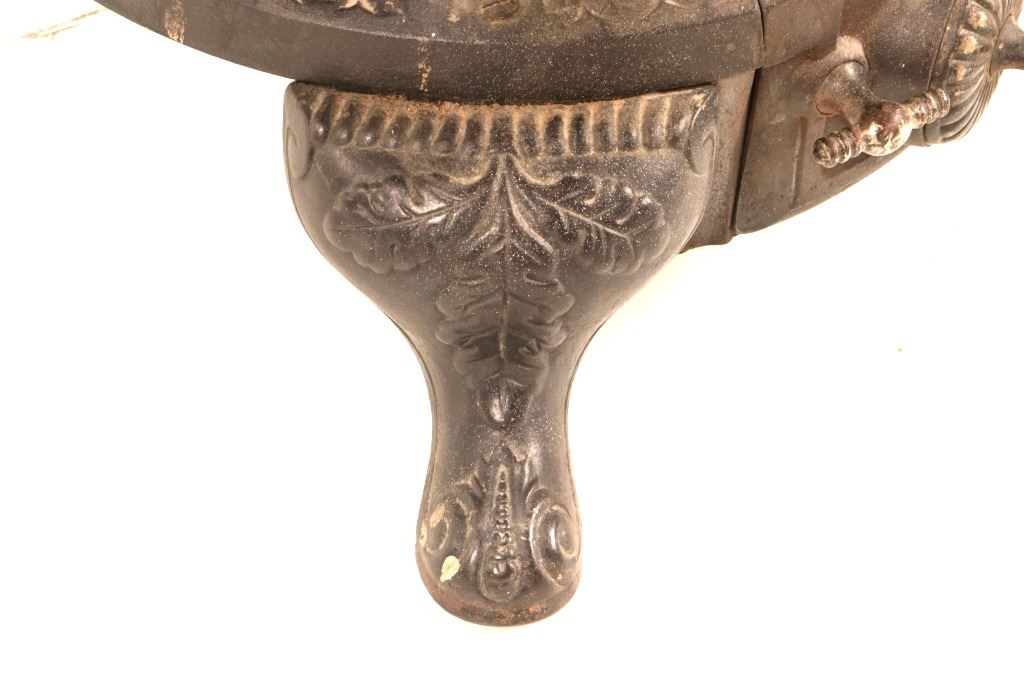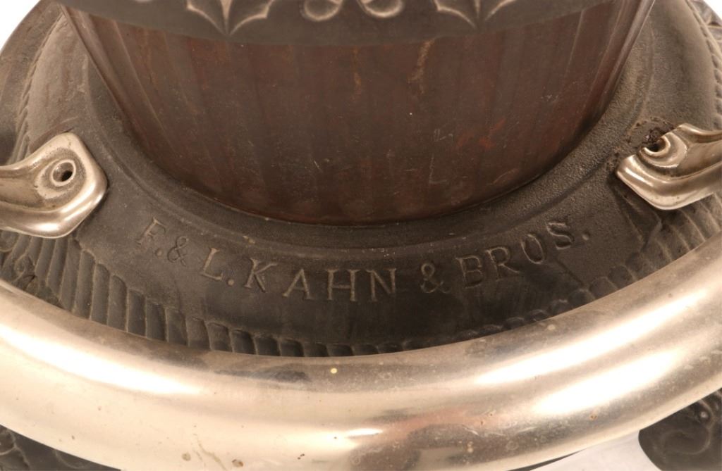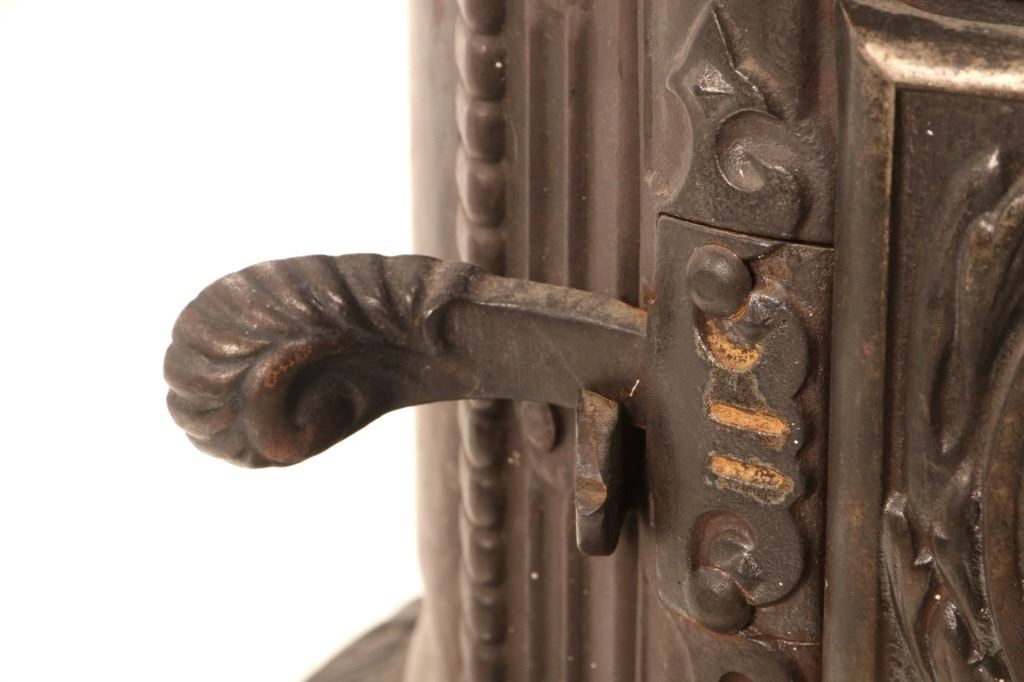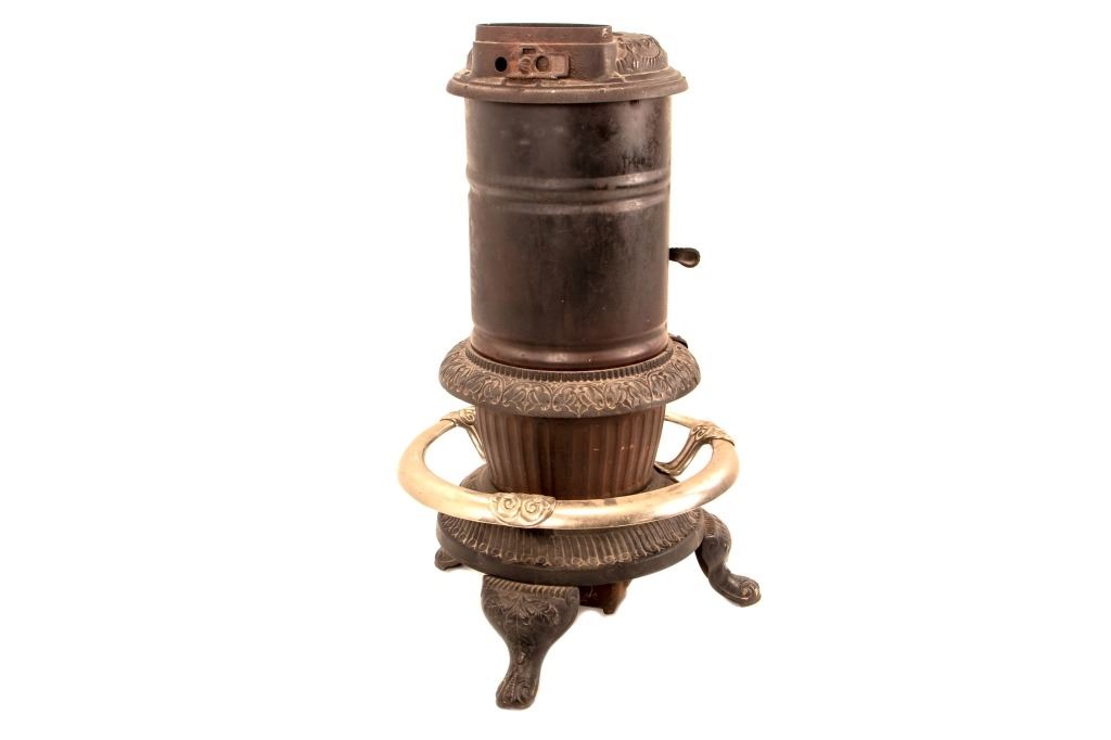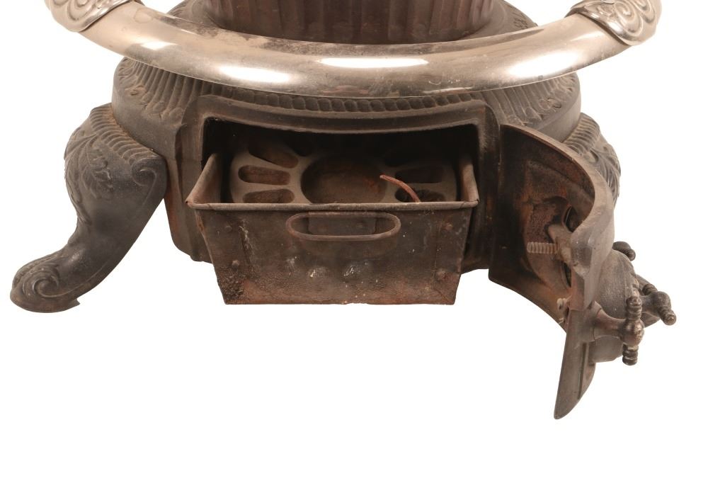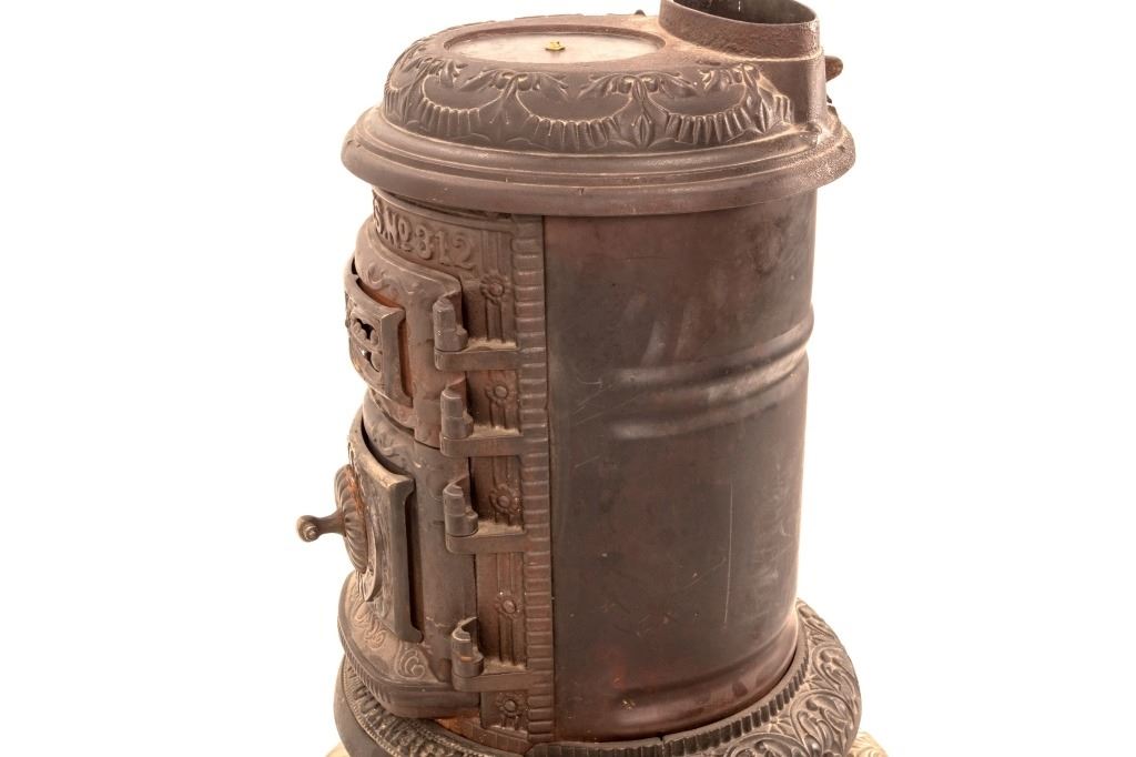 Featured in this lot is this F series no. 312 Wood stove from F. & L. Kahn & Bros, circa 1890-1894. The stove shows wonderful and professional construction and reads “W. P. McCormick” on the front; “Jointless Ashpit patent app'd for” along the side and ashpit; “F. & L. Kahn & Bros” on the back lip; “F Series no. 312” under the front door and the patent dates inside the front doors. Lazard and Felix Kahn moved their stove foundry operation from Hanging Rock, Ohio to Hamilton in 1884. Shortly afterwards, their market greatly expanded to include the entire United States and shipments to Europe and the Far East. The company began making gas stoves in 1888 and the name was changed to Estate Stove Company in 1905. Estate was purchased by RCA in 1952 and then by Whirlpool-Seeger in 1955. They closed the Hamilton plant in 1962. Over the lifetime of the company, they made wood and coal burning cook stoves, gas cook stoves, parlor heating stoves, the more modern Heatrola Stoves, and gas furnaces. The condition of this pot belly stove is fair, with the ring connected to the ashpit disconnected and broken on one tine; otherwise, there are no other obvious signs of damage. The measurements of this wood stove are 20 1/2" x 20 1/2" x 38".