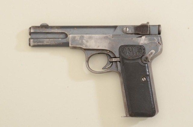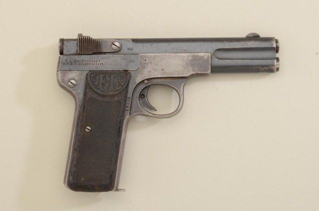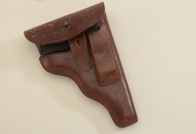 F.L. Selbstlader semi-auto pistol, 7.65mm cal., 4” barrel, blue finish, checkered hard rubber grips; #17009. This gun is in overall fair to good condition showing approx. 30% muted blue finish, fair bore, good action and markings, fair grips; with brown leather flap holster. Est.: $150-$250.