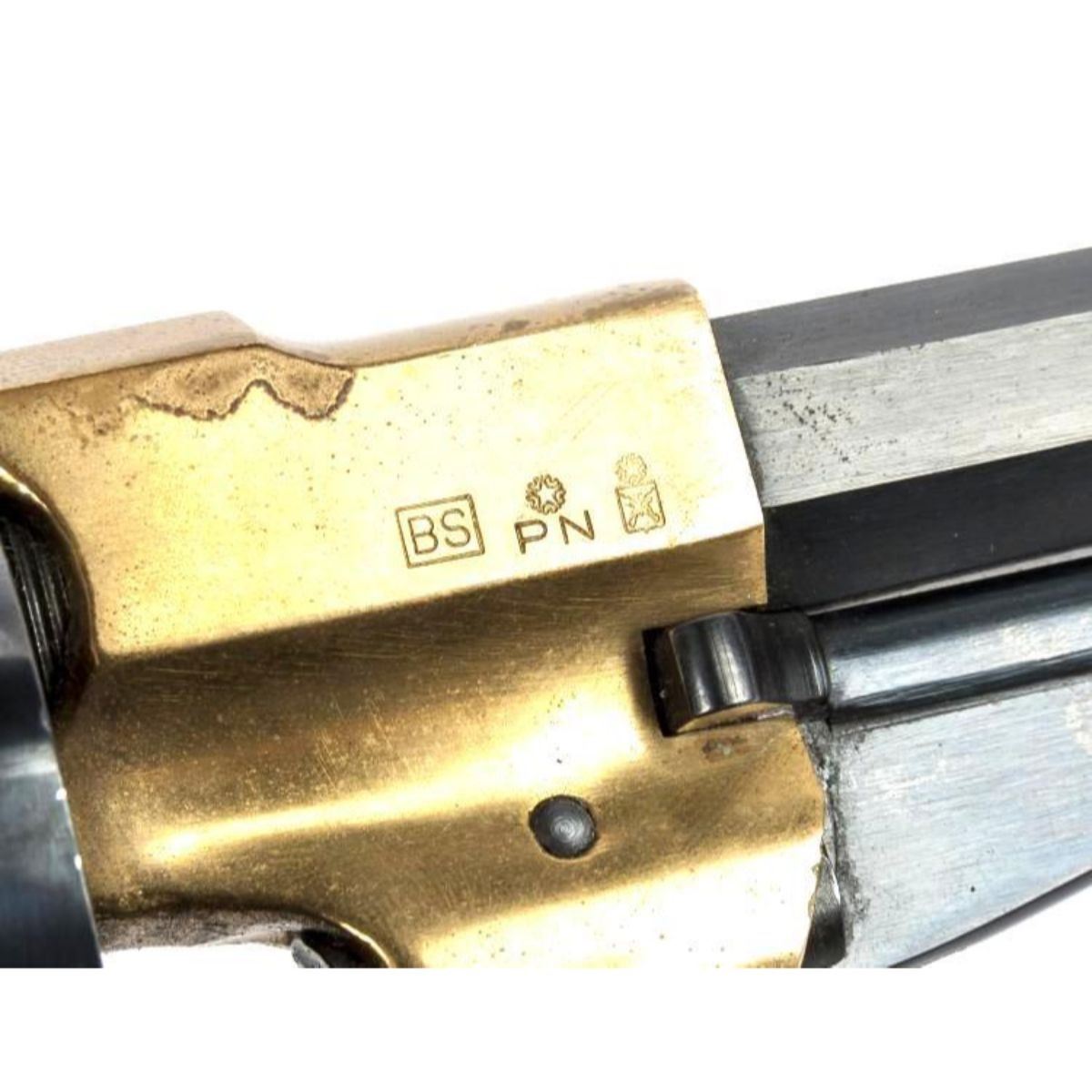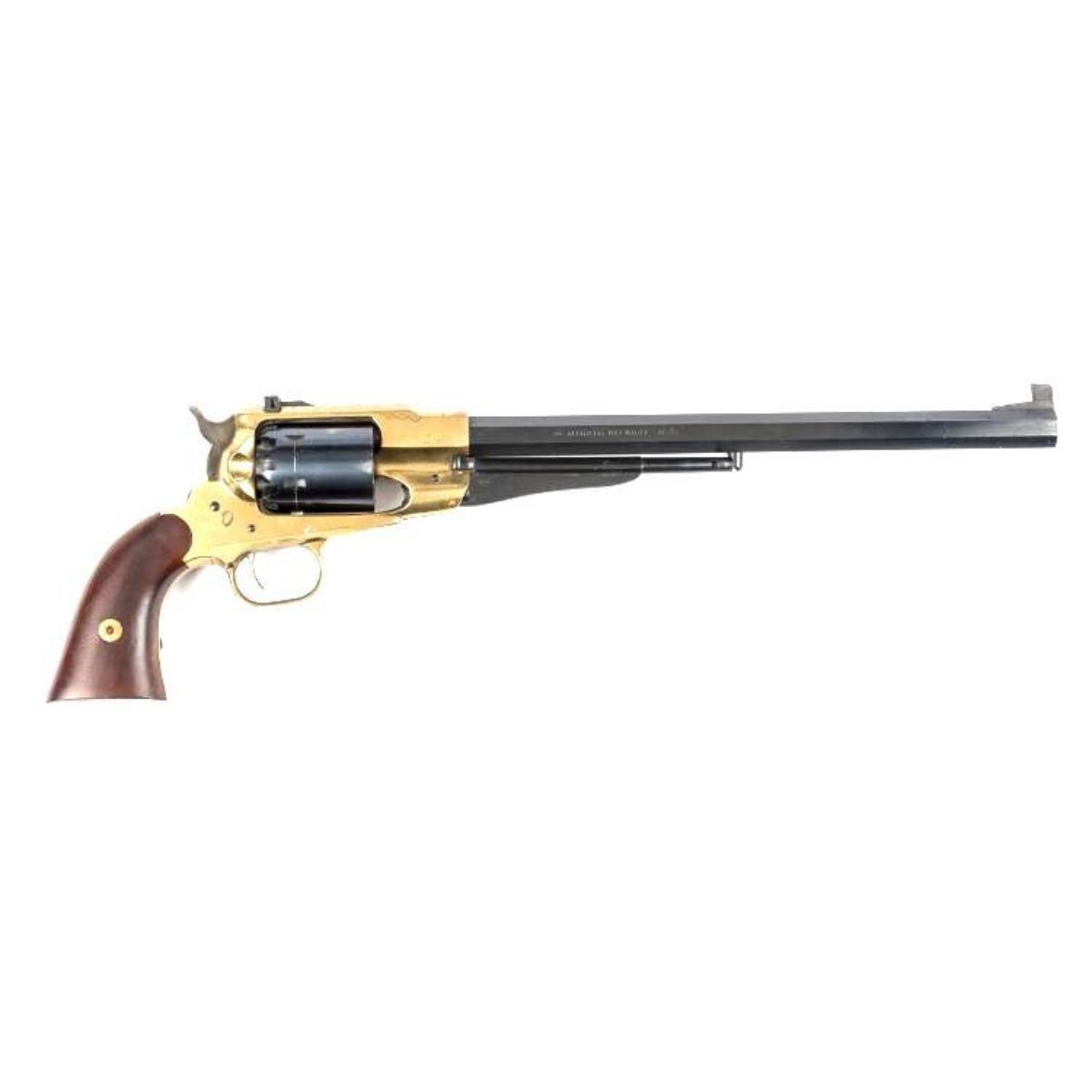 SERIAL NUMBER: R315394 DESIGN: Single action revolver. 10-1/2" octagonal barrel. .44 caliber. MATERIAL/FINISH COMPOSITION: Blued metal. Brass frame. Walnut grips. CONDITION: Very good. Minor scratching and rubs to blued components.