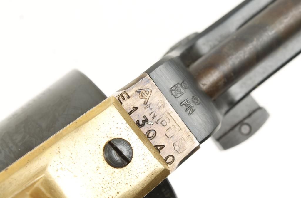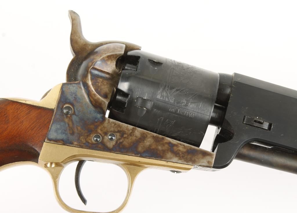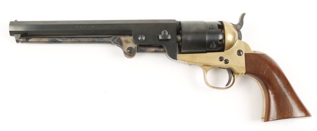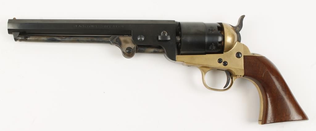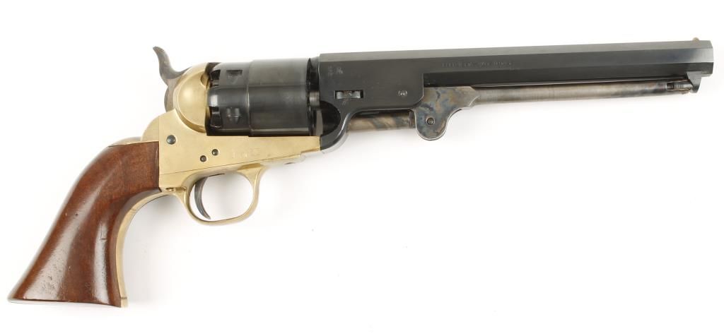 Italian made copy of the 1851 Navy open top percussion revolver. Blued 7-3/8" octagon barrel and non fluted cylinder. Case colored hammer, trigger and loading lever, brass frame, trigger guard and grip strap and smooth walnut grips. Condition: Very good showing light use.