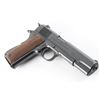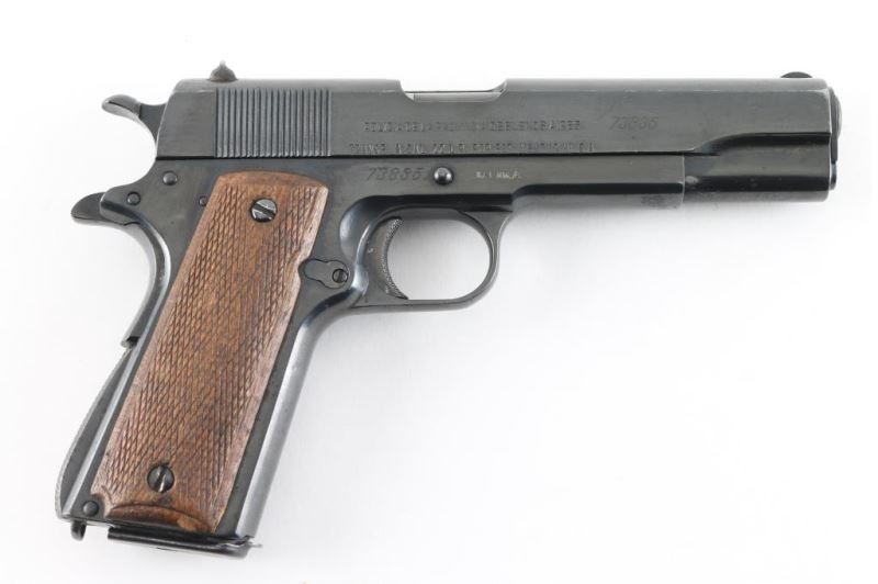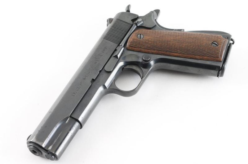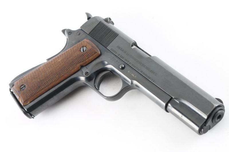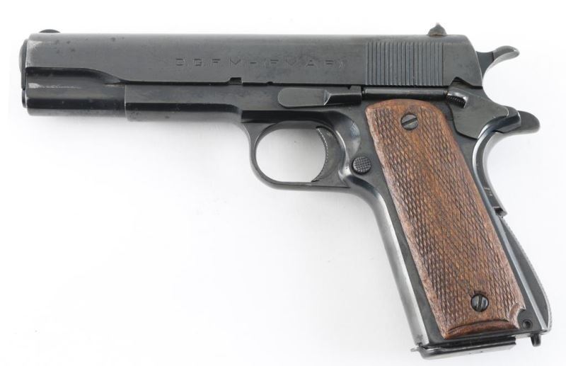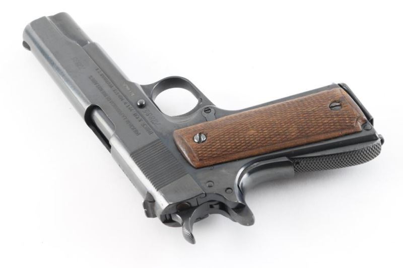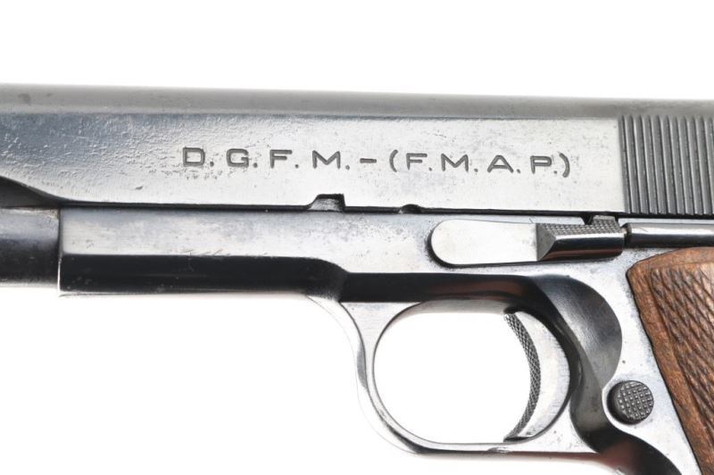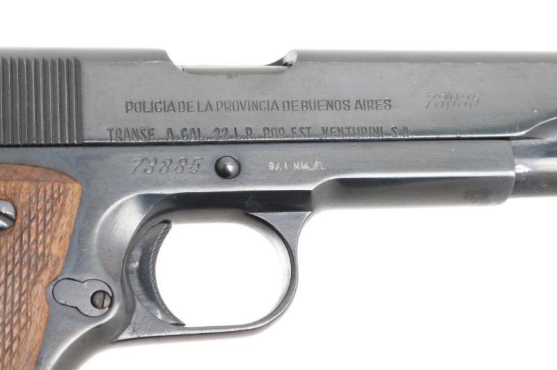Argentine manufactured copy of the Colt 1911A1, imported by GAI, Miami FL, converted to 22 Long Rifle for training purposes, appears to have a floating chamber type barrel similar to "Ace" type rimfire pistols. Features re-blued finish, 5" barrel, fixed blade front & dovetailed notch rear sight, knurled arched mainspring housing with lanyard loop, grip safety, frame mounted manual safety, knurled wide hammer. Rimfire magazine does not lock slide back when empty. Bore is very good. Retains 90% dark refinish over previous pits and other blemishes. Slide matches frame, magazine numbered "82197". Slide marked "POLICIA DE LA PROVINCIA DE BUENOS AIRES". Checkered wood grips are good, much smoothing and some light erosion. Condition is NRA Good+ (reblued) *** C&R Firearm ***