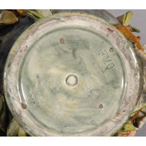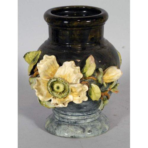 F.M. COMPANY MAJOLICA VASE with encrusted flowers 10" high CONDITION REPORT: chips to flowers. PACKING AND SHIPPING: We offer packing (double boxed in most cases) and shipping of this item within the Continental United States by USPS or UPS (our choice- boxes over 30lbs or oversized may be recalculated based on buyer's location), NOT INCLUDING INSURANCE (it will be added when we know the sales price) for $40