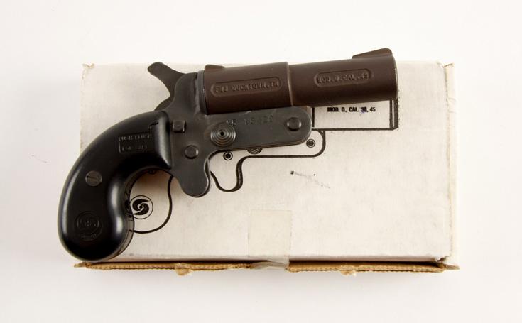 F.M.J. Cobray Mdl D Cal .45 SN:4518429 Inexpensive single shot top break pocket pistol. Phosphate finish, black plastic grips, 2" barrel, good bore and action. Condition: Excellent with no sign of use. In original box.Inexpensive single shot top break pocket pistol. Phosphate finish, black plastic grips, 2" barrel, good bore and action. Condition: Excellent with no sign of use. In original box.