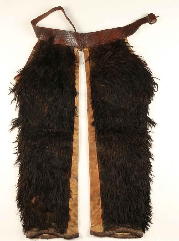 Maker marked on tooled basket weave motif band, black wooly fur, made in San Jose California. Tear in belt otherwise very good