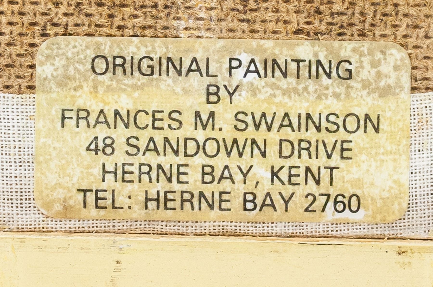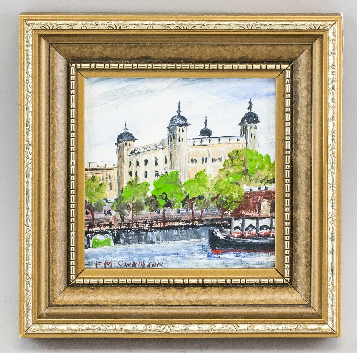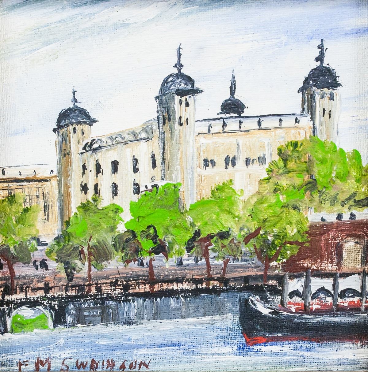 Oil on panel, framed. Featuring landscape scene with the Tower of London in the background. Signed "F. M. Swainson" on the bottom left corner. Sticker affixed to verso reads: ORIGINAL PAINTING BY FRANCES M. SWAINSON 48 SANDOWN DRIVE HERNE BAY, KENT TEL: HERNE BAY 2760". "Tower of London" inscribed on verso. 9.5 x 9.5 cm (3.75 x 3.75 inches), framed: 14 x 14 cm (5.5 x 5.5 inches)