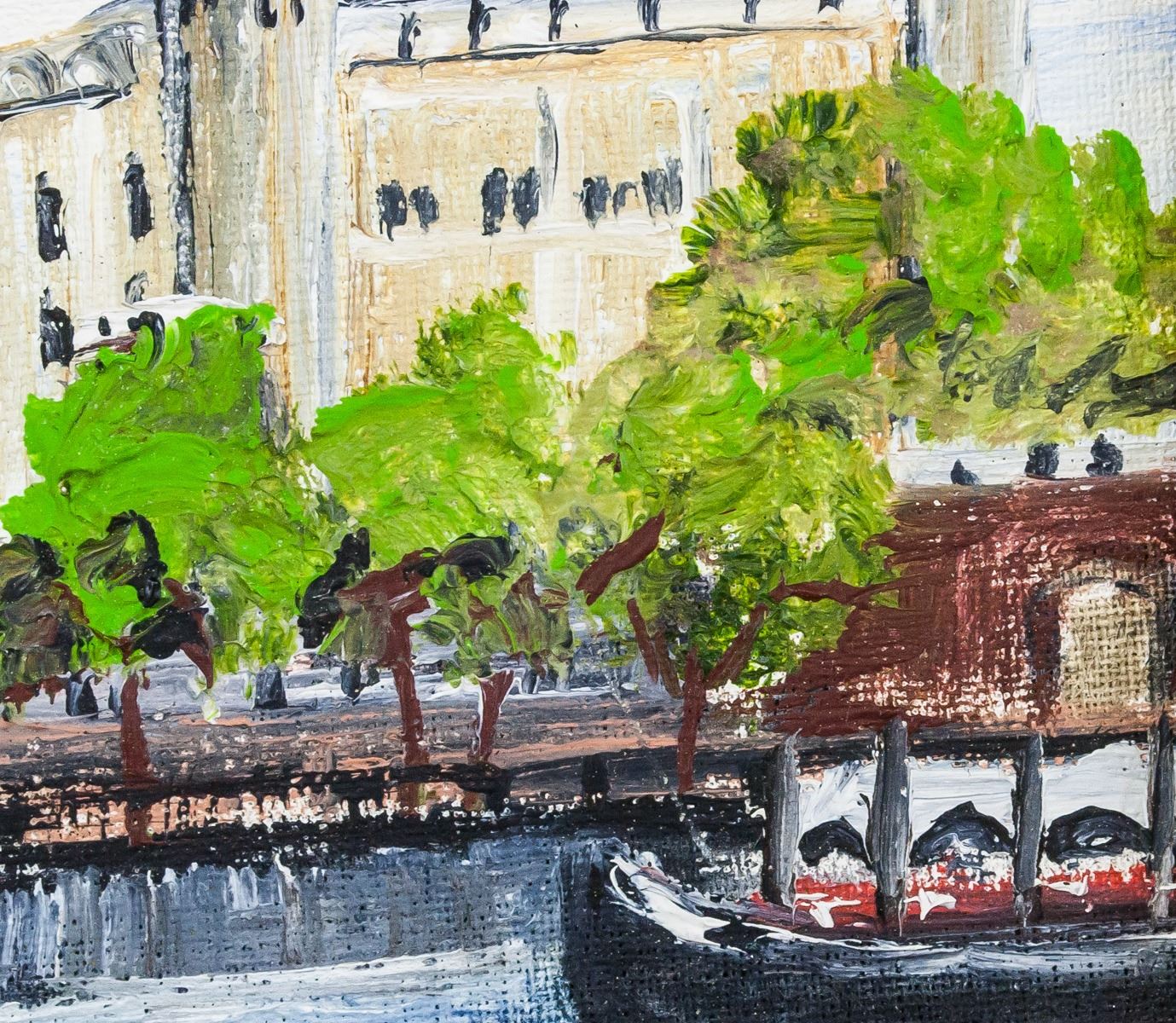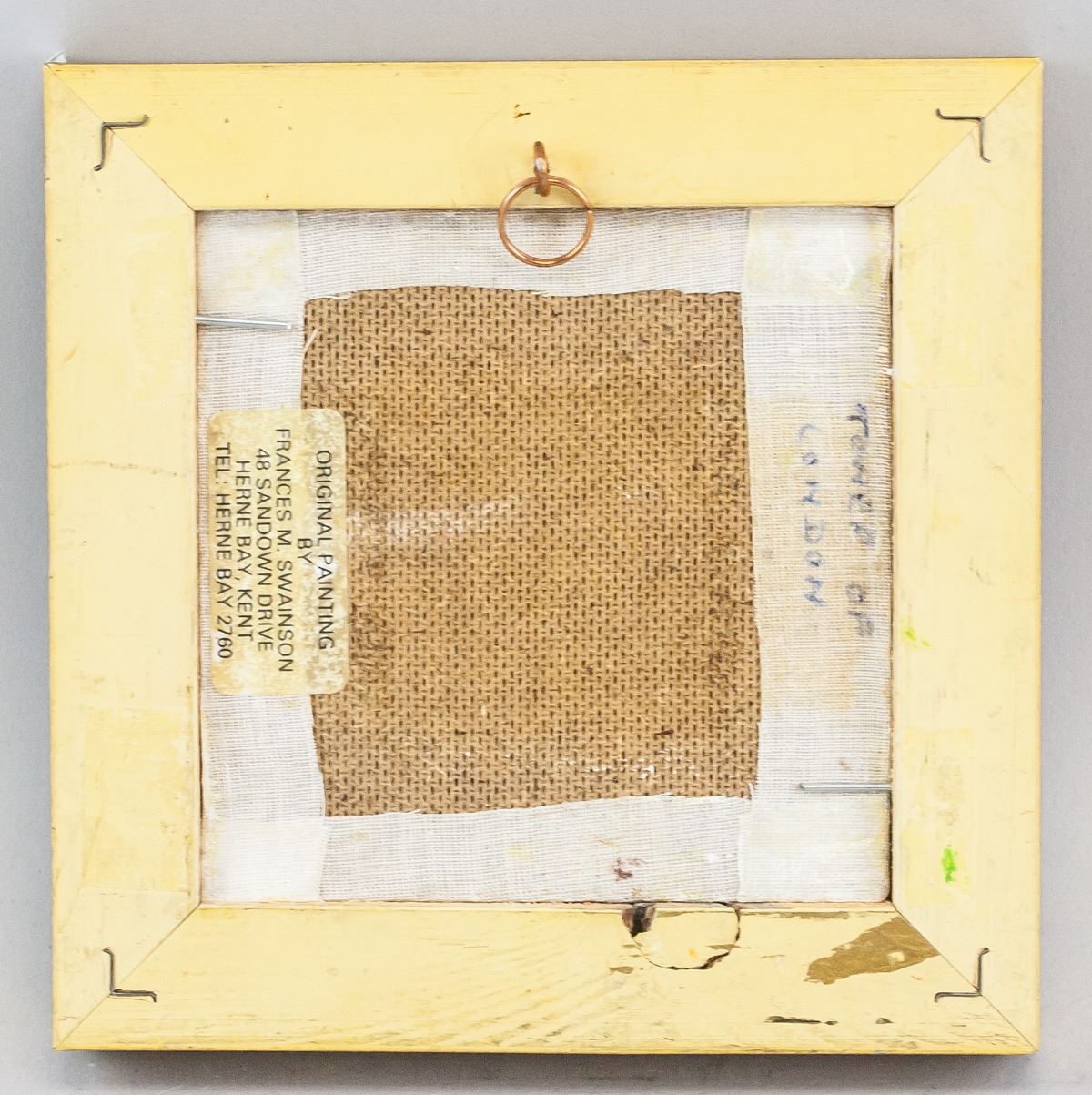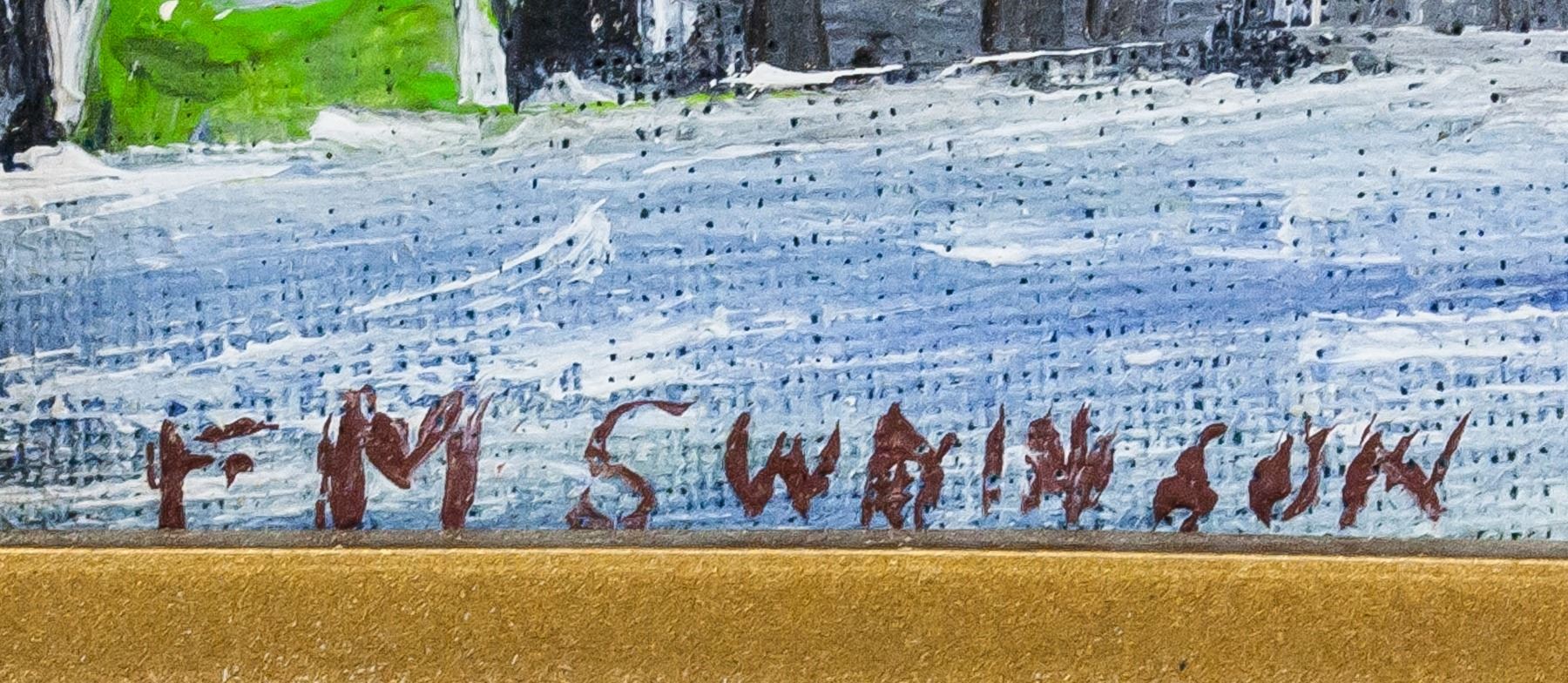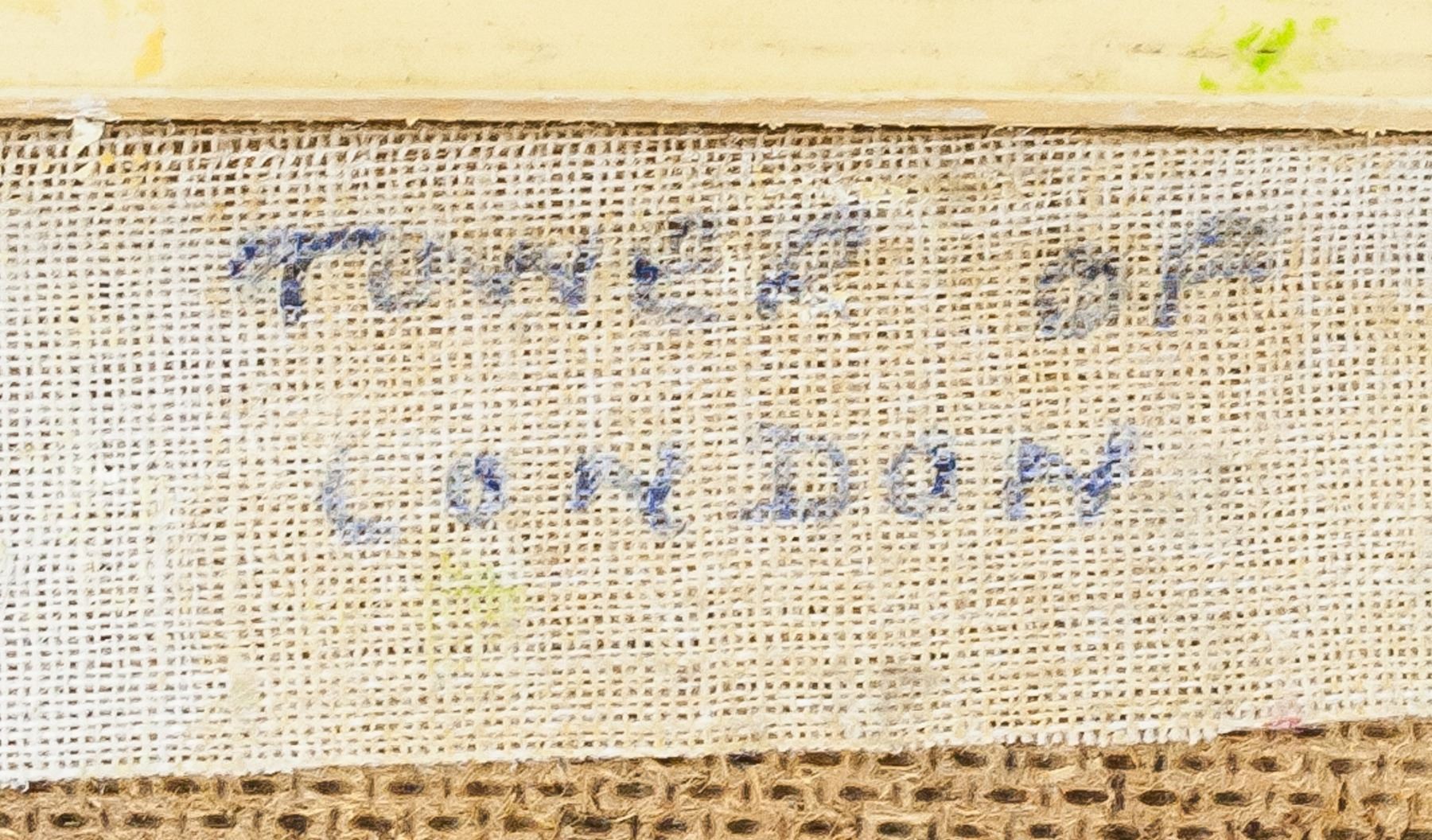 Oil on panel, framed. Featuring landscape scene with the Tower of London in the background. Signed "F. M. Swainson" on the bottom left corner. Sticker affixed to verso reads: ORIGINAL PAINTING BY FRANCES M. SWAINSON 48 SANDOWN DRIVE HERNE BAY, KENT TEL: HERNE BAY 2760". "Tower of London" inscribed on verso. 9.5 x 9.5 cm (3.75 x 3.75 inches), framed: 14 x 14 cm (5.5 x 5.5 inches)