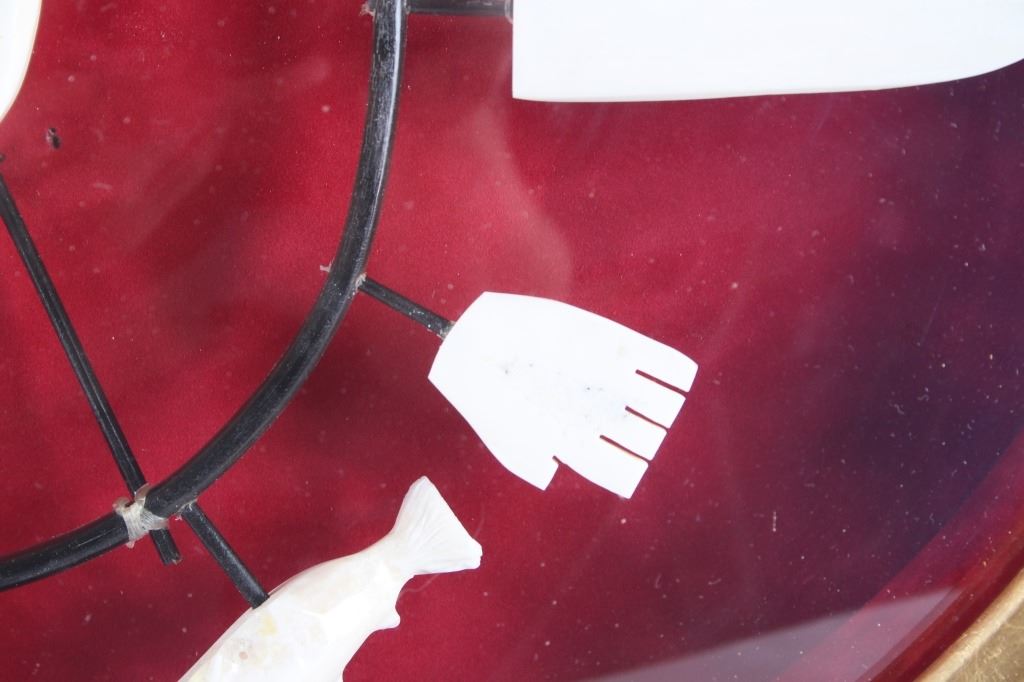 This is an amazing Eskimo Yup’ik Loon Nunivak Mask / Spirit Wheel made of walrus tusk, whalebone and baleen by Aleut Eskimo Cup’ik Cevak, Alaska artist, Franklin Matchian from circa 2003. The piece comes with the memo denoting it was purchased for $1,200.00 by Dan and Bonnie Paynich of Great Falls, Montana from the artist Franklin Matchian, referred to as an I.V.O.R.Y. Loon Mask sold on September 25, 2003. The spirit mask is made of carved walrus tusk, baleen rings, whale sinew ties with a carved fish in the loon’s bill made of fossilized / petrified mammoth tusk, with the baleen ring representing the Universe or Sea and the loon at the center representing the Inua or Spirit. The carved tusk figures are as such; Hunter at top, King Salmon, Traditional hand design, wings, feet, diving seal, tail of loon. Franklin Matchian was born 1966 in Cevak, Alaska and later moved to Anchorage, Alaska. He is of Native American decent, with some of his pieces being marked as Eskimo. He operates Cikumi - "On the Ice" Eskimo Arts by Franklin Matchian a gallery. The piece is truly incredible showing a large size with immense detail by a noted Eskimo artist who used only the finest materials. The piece of paper with noted information is stored on the back of the custom curved glass or bowed glass oval frame. Frame measures 20” by 17” by 3”. Total weight of 8 lbs. 10 oz.
