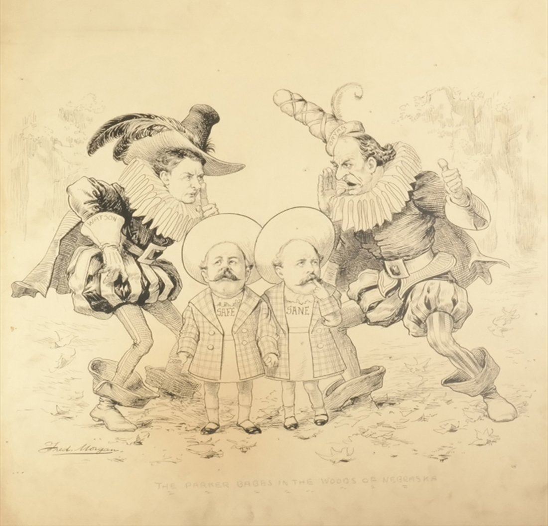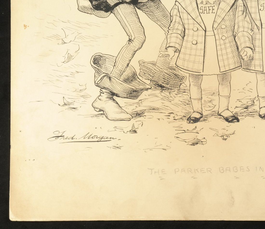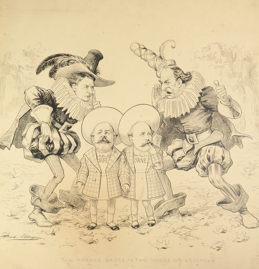 Pencil, pen & ink on carton. Signed lower left, "Fred. Morgan". Depicts two mustached children looking up at arguing actors labeled as Democratic/Populist presidential candidate William Jennings Bryan and populist running mate Thomas E. Watson.
