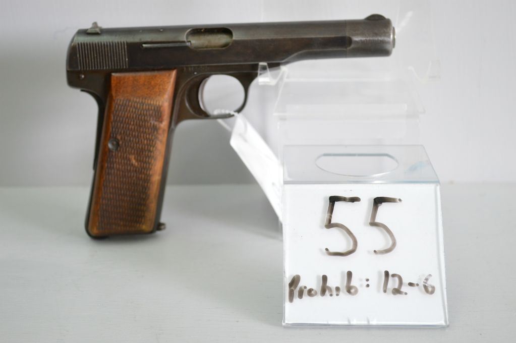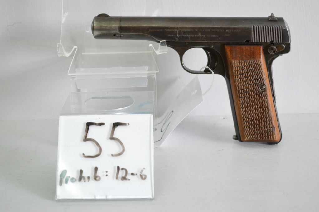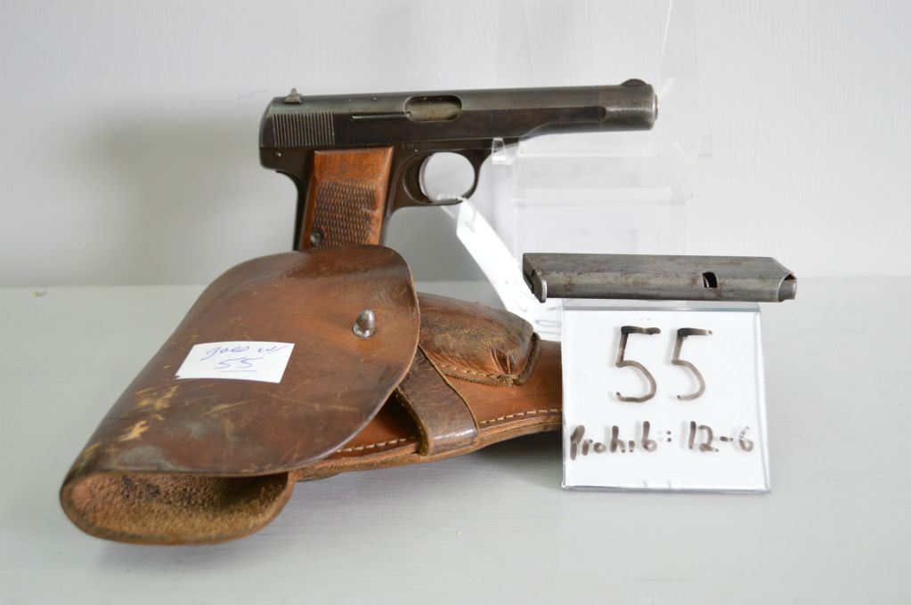 F.N. Browning Mod 1922 7.65 MM cal 9 shot Semi Auto PIstol w/ 114 mm bbl [ Nazi marked, left side trigger guard stamped MR, w/ fading blue finish w/some holster wear, good walnut checkered wooden grips, c/w extra mag, w/ leather holster ] Ser # 116955 Prohib 12-6 Cert # TCI